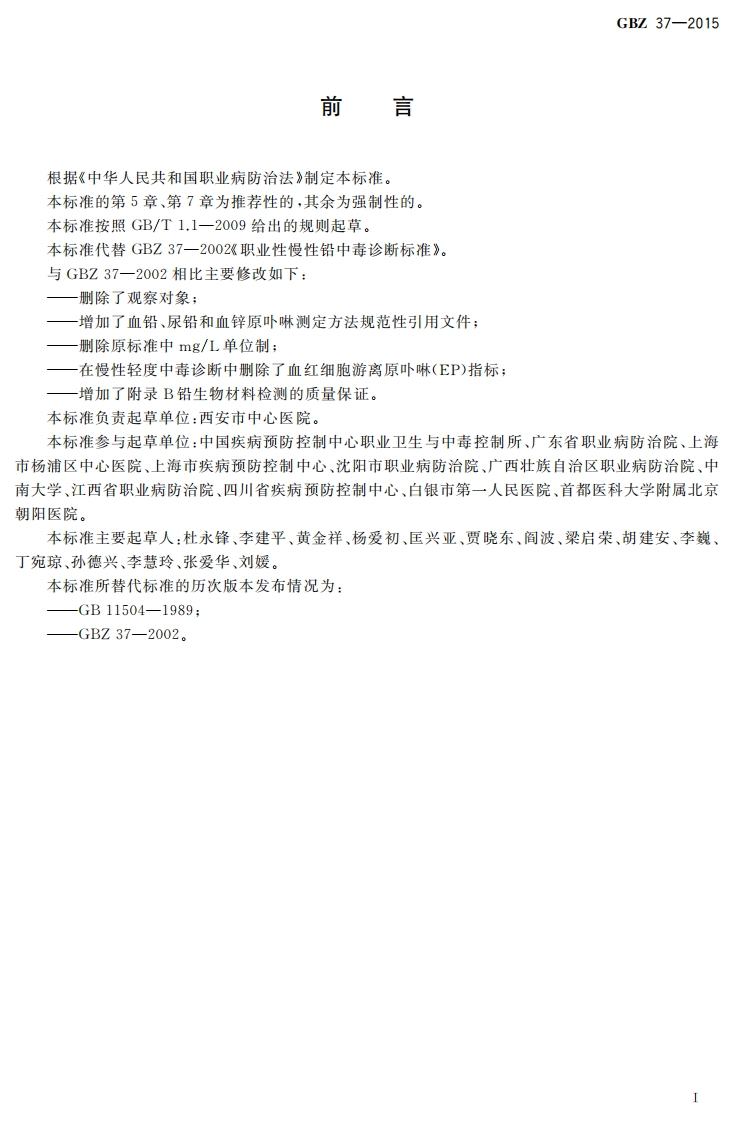 职业性慢性铅中毒的诊断Diagnosisofoccupationalchronicleadpoisoning348072@abc昨天发布关注私信0.61MB8页046职业性慢性铅中毒的诊断Diagnosisofoccupationalchronicleadpoisoning此内容为付费资源,请付费后查看¥13¥19黄金会员免费钻石会员免费立即购买您当前未登录!建议登陆后购买,可保存购买订单付费资源 第1页 / 共8页 第2页 / 共8页 第3页 / 共8页 第4页 / 共8页 第5页 / 共8页 试读已结束,还剩3页,您可下载完整版后进行离线阅读 THE END标准规范 文本预览 1CS13.100C60G8Z中华人民共和国国家职业卫生标准GBZ37-2015代替GBZ37一2002职业性慢性铅中毒的诊断Diagnosis of occupational chronic lead poisoning2015-12-15发布2016-05-01实施中华人民共和国国家卫生和计划生育委员会发布 查看更多 收起部分 喜欢就支持一下吧收藏