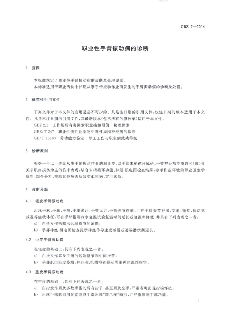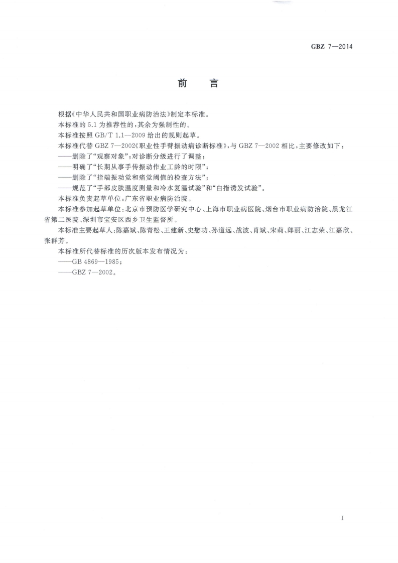 职业性手臂振动病的诊断Diagnosisofoccupationalhand-armvibrationdisease348072@abc昨天发布关注私信2.40MB7页027职业性手臂振动病的诊断Diagnosisofoccupationalhand-armvibrationdisease此内容为付费资源,请付费后查看¥13¥19黄金会员免费钻石会员免费立即购买您当前未登录!建议登陆后购买,可保存购买订单付费资源 第1页 / 共7页 第2页 / 共7页 第3页 / 共7页 第4页 / 共7页 第5页 / 共7页 试读已结束,还剩2页,您可下载完整版后进行离线阅读 THE END标准规范 文本预览 1CS13.100C60GB☑中华人民共和国国家职业卫生标准GBZ7-2014代替GBZ7一2002职业性手臂振动病的诊断Diagnosis of occupational hand-arm vibration disease2014-10-13发布2015-03-01实施中华人民共和国国家卫生和计划生育委员会发布 查看更多 收起部分 喜欢就支持一下吧收藏