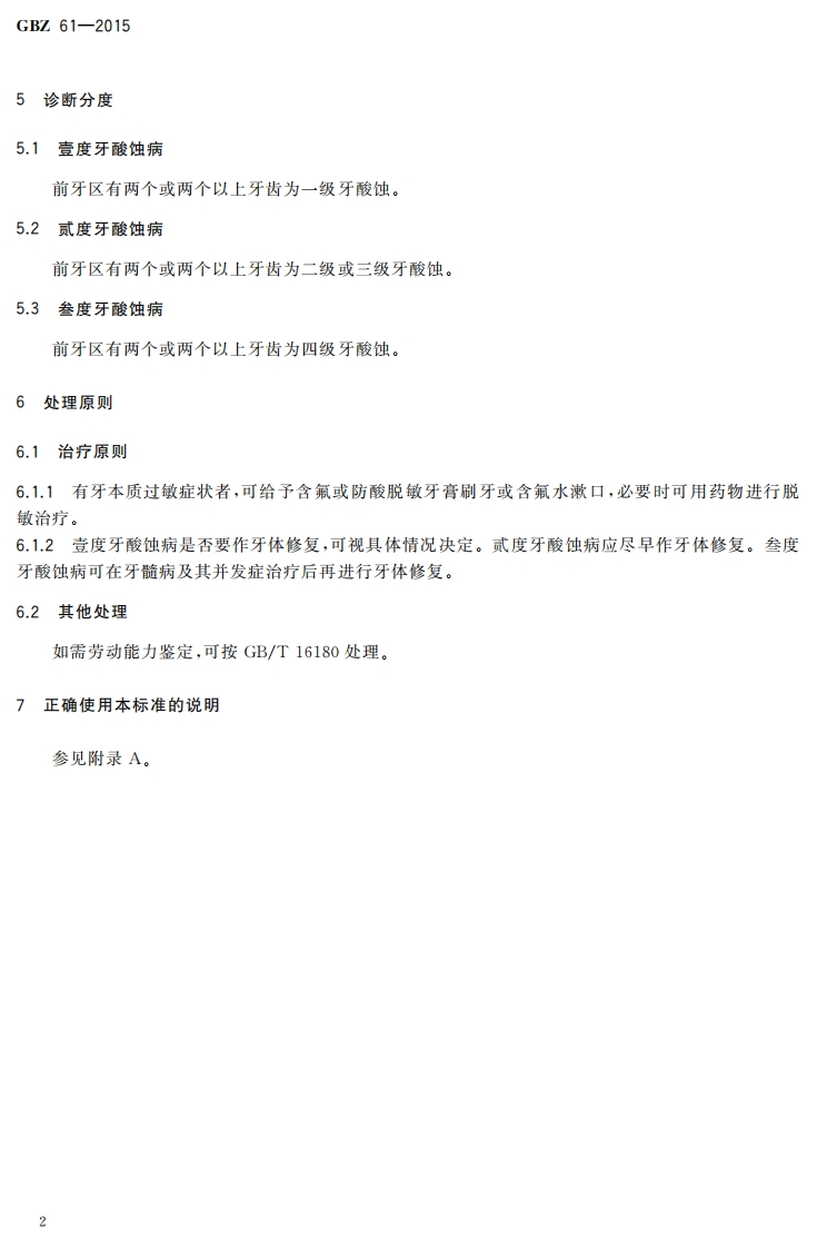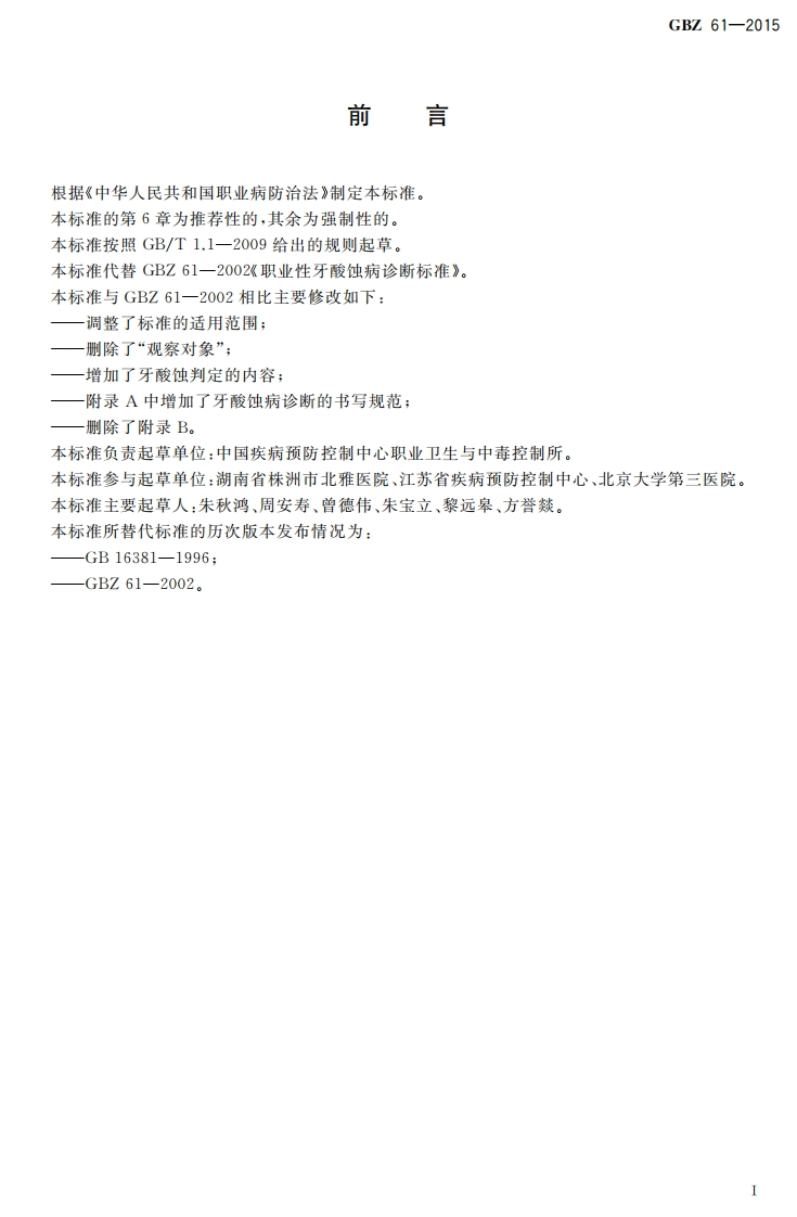 职业性牙酸蚀病的诊断Diagnosisofoccupationaldentalerosion348072@abc前天发布关注私信0.29MB5页020职业性牙酸蚀病的诊断Diagnosisofoccupationaldentalerosion此内容为付费资源,请付费后查看¥13¥19黄金会员免费钻石会员免费立即购买您当前未登录!建议登陆后购买,可保存购买订单付费资源 第1页 / 共5页 第2页 / 共5页 第3页 / 共5页 第4页 / 共5页 第5页 / 共5页 已完成全部阅读,共5页 THE END标准规范 文本预览 1CS13.100C60G82中华人民共和国国家职业卫生标准GBZ61-2015代替GBZ61一2002职业性牙酸蚀病的诊断Diagnosis of occupational dental erosion2015-09-09发布2016-03-01实施中华人民共和国国家卫生和计划生育委员会发布 查看更多 收起部分 喜欢就支持一下吧收藏
