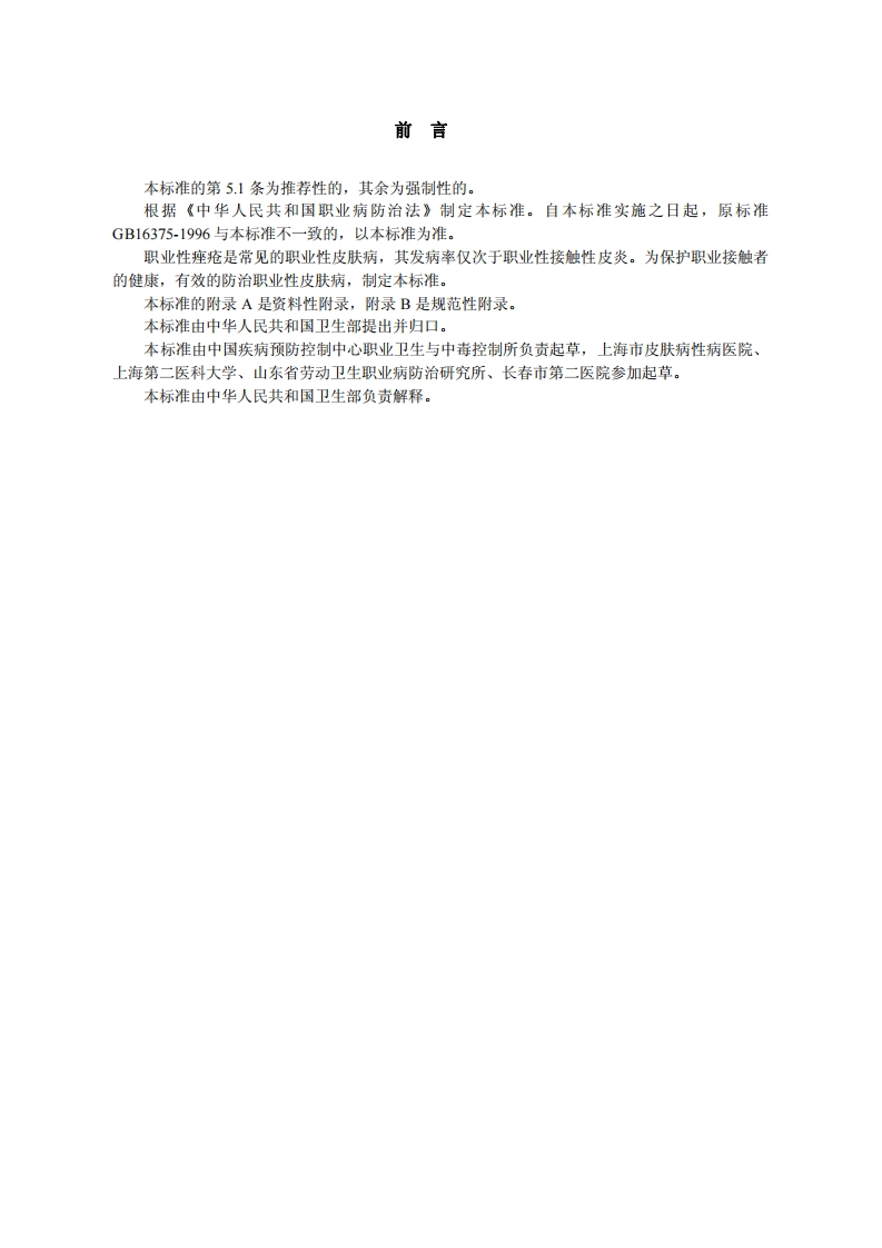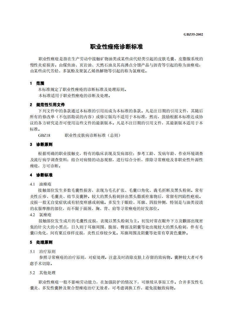 职业性痤疮诊断标准DiagnosticCriteriaofOccupationalAcne1、1、1348072@abc前天发布关注私信0.13MB6页036职业性痤疮诊断标准DiagnosticCriteriaofOccupationalAcne1、1、1此内容为付费资源,请付费后查看¥13¥19黄金会员免费钻石会员免费立即购买您当前未登录!建议登陆后购买,可保存购买订单付费资源 第1页 / 共6页 第2页 / 共6页 第3页 / 共6页 第4页 / 共6页 第5页 / 共6页 试读已结束,还剩1页,您可下载完整版后进行离线阅读 THE END标准规范 文本预览 1CS13.100C60GBZ中华人民共和国国家职业卫生标准GBZ55-2002职业性痤疮诊断标准Diagnostic Criteria of Occupational Acne2002-04-08发布2002-06-01实施中华人民共和国卫生部发布 查看更多 收起部分 喜欢就支持一下吧收藏