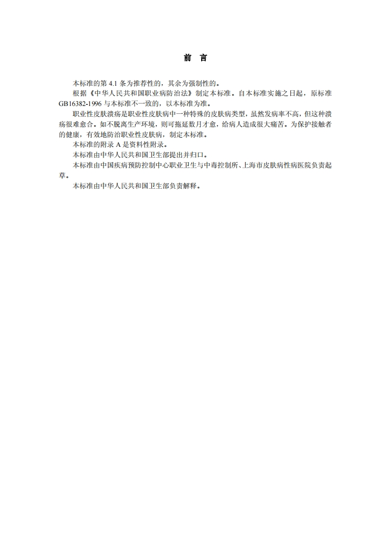 职业性皮肤溃疡诊断标准DiagnosticCriteriaofOccupationalUlcers1、1、1348072@abc3天前发布关注私信0.11MB4页035职业性皮肤溃疡诊断标准DiagnosticCriteriaofOccupationalUlcers1、1、1此内容为付费资源,请付费后查看¥13¥19黄金会员免费钻石会员免费立即购买您当前未登录!建议登陆后购买,可保存购买订单付费资源 第1页 / 共4页 第2页 / 共4页 第3页 / 共4页 第4页 / 共4页 已完成全部阅读,共4页 THE END标准规范 文本预览 1CS13.100C60GBZ中华人民共和国国家职业卫生标准GBZ62-2002职业性皮肤溃疡诊断标准Diagnostic Criteria of Occupational Ulcers2002-04-08发布2002-06-01实施中华人民共和国卫生部发布 查看更多 收起部分 喜欢就支持一下吧收藏