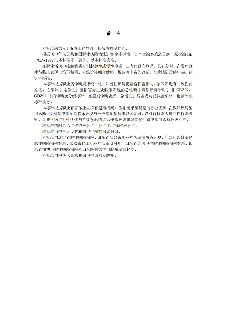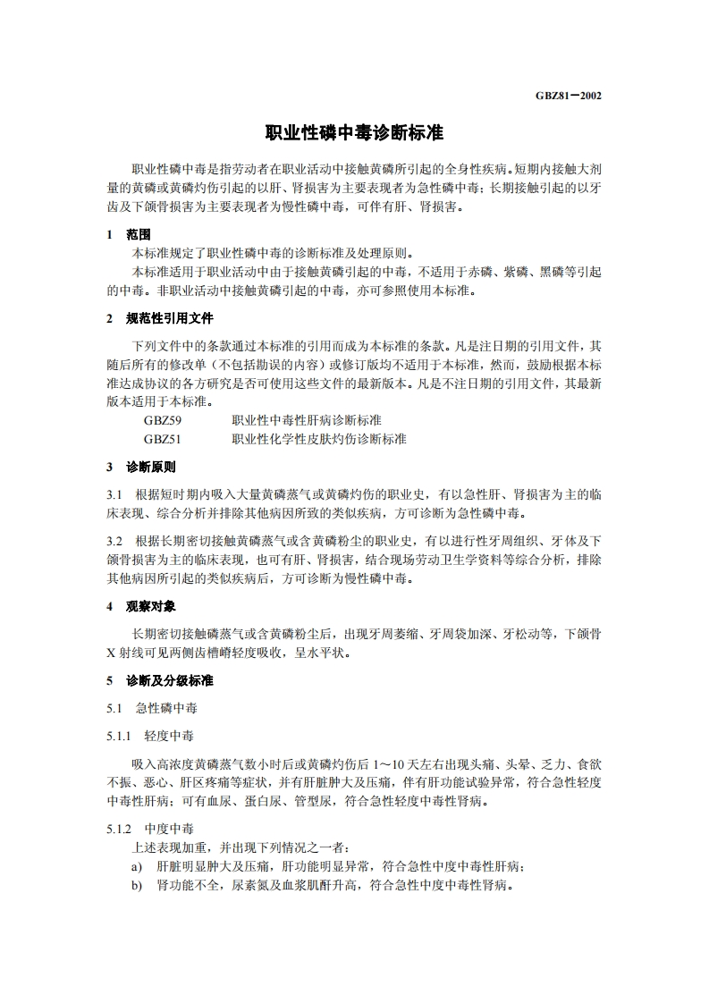 职业性磷中毒诊断标准DiagnosticCriteriaofOccupationalPhosphorusPoisoning348072@abc3天前发布关注私信0.15MB6页047职业性磷中毒诊断标准DiagnosticCriteriaofOccupationalPhosphorusPoisoning此内容为付费资源,请付费后查看¥13¥19黄金会员免费钻石会员免费立即购买您当前未登录!建议登陆后购买,可保存购买订单付费资源 第1页 / 共6页 第2页 / 共6页 第3页 / 共6页 第4页 / 共6页 第5页 / 共6页 试读已结束,还剩1页,您可下载完整版后进行离线阅读 THE END标准规范 文本预览 1CS13.100C60GBZ中华人民共和国国家职业卫生标准GBZ81-2002职业性磷中毒诊断标准Diagnostic Criteria of Occupational Phosphorus Poisoning2002-04-08发布2002-06-01实施中华人民共和国卫生部发布 查看更多 收起部分 喜欢就支持一下吧收藏