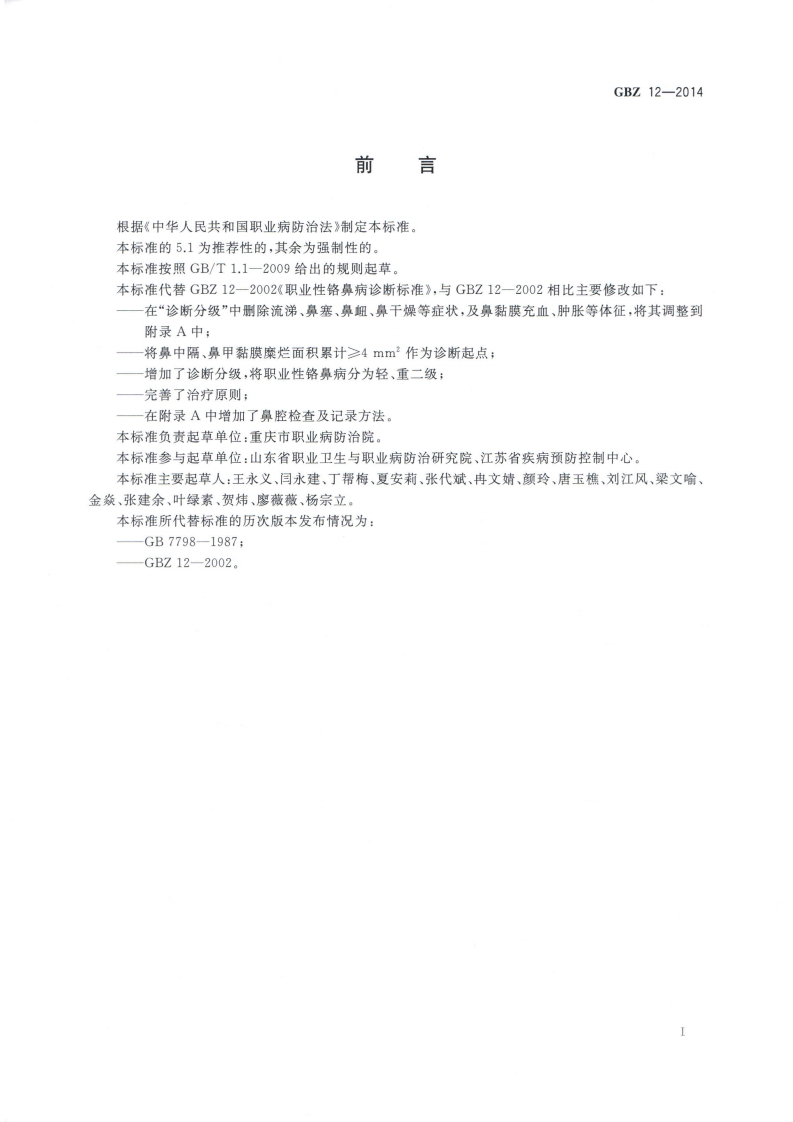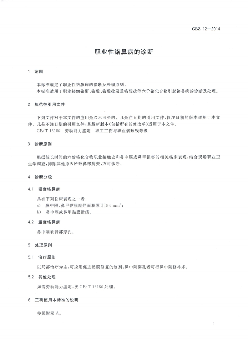 职业性铬皇病的诊断Diagnosisofoccupationalchromiuminducednasaldisease348072@abc4天前发布关注私信1.31MB4页020职业性铬皇病的诊断Diagnosisofoccupationalchromiuminducednasaldisease此内容为付费资源,请付费后查看¥13¥19黄金会员免费钻石会员免费立即购买您当前未登录!建议登陆后购买,可保存购买订单付费资源 第1页 / 共4页 第2页 / 共4页 第3页 / 共4页 第4页 / 共4页 已完成全部阅读,共4页 THE END标准规范 文本预览 1CS13.100C60GEZ中华人民共和国国家职业卫生标准GBZ12-2014代替GBZ12—2002职业性铬鼻病的诊断Diagnosis of occupational chromium induced nasal disease2014-1013发布2015-03-01实施中华人民共和国国家卫生和计划生育委员会发布 查看更多 收起部分 喜欢就支持一下吧收藏