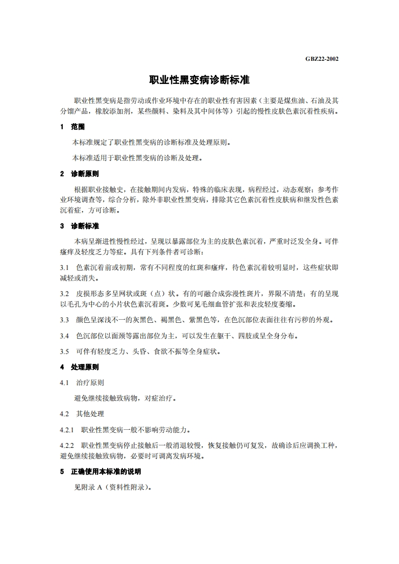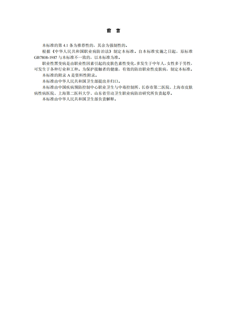 职业性黑变病诊断标准DiagnosticCriteriaofOccupationalMelanosis348072@abc4天前发布关注私信0.11MB4页032职业性黑变病诊断标准DiagnosticCriteriaofOccupationalMelanosis此内容为付费资源,请付费后查看¥13¥19黄金会员免费钻石会员免费立即购买您当前未登录!建议登陆后购买,可保存购买订单付费资源 第1页 / 共4页 第2页 / 共4页 第3页 / 共4页 第4页 / 共4页 已完成全部阅读,共4页 THE END标准规范 文本预览 1CS13.100C60GBZ中华人民共和国国家职业卫生标准GBZ22-2002职业性黑变病诊断标准Diagnostic Criteria of Occupational Melanosis2002-04-08发布2002-06-01实施中华人民共和国卫生部发布 查看更多 收起部分 喜欢就支持一下吧收藏