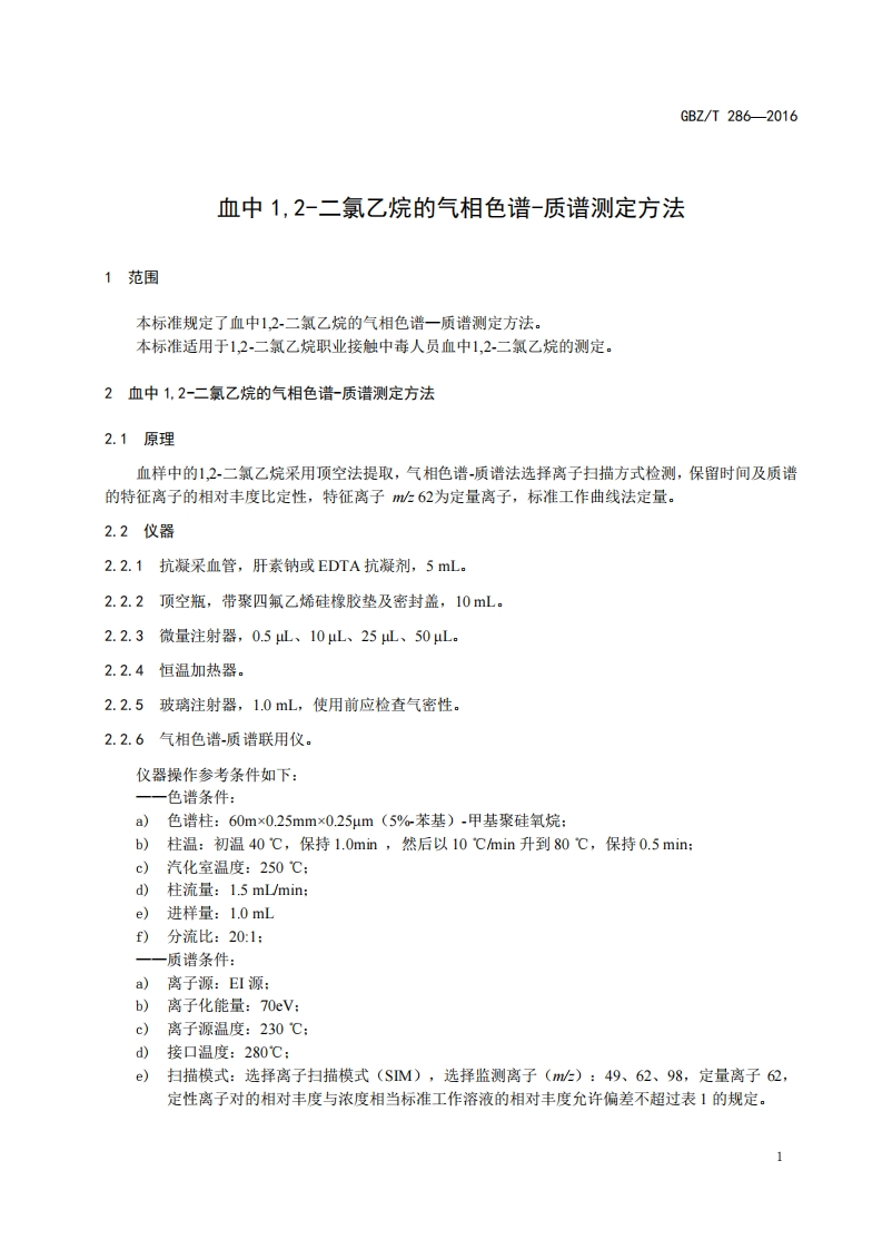 血中12-二氯乙烷的气相色谱-质谱测定方法MMethodfordeterminationof12-dichloroethaneinbloodbygaschromatography-massspectrometry348072@abc5天前发布关注私信0.36MB5页031血中12-二氯乙烷的气相色谱-质谱测定方法MMethodfordeterminationof12-dichloroethaneinbloodbygaschromatography-massspectrometry此内容为付费资源,请付费后查看¥13¥19黄金会员免费钻石会员免费立即购买您当前未登录!建议登陆后购买,可保存购买订单付费资源 第1页 / 共5页 第2页 / 共5页 第3页 / 共5页 第4页 / 共5页 第5页 / 共5页 已完成全部阅读,共5页 THE END标准规范 文本预览 ICS13.100C52FBZ中华人民共和国国家职业卫生标准GBZT286-2016血中1,2-二氯乙烷的气相色谱-质谱测定方法Method for determination of 1,2-dichloroethane in blood by gaschromatography-mass spectrometry2016-11-29发布2017-05-01实施中华人民共和国国家卫生和计划生育委员会发布 查看更多 收起部分 喜欢就支持一下吧收藏