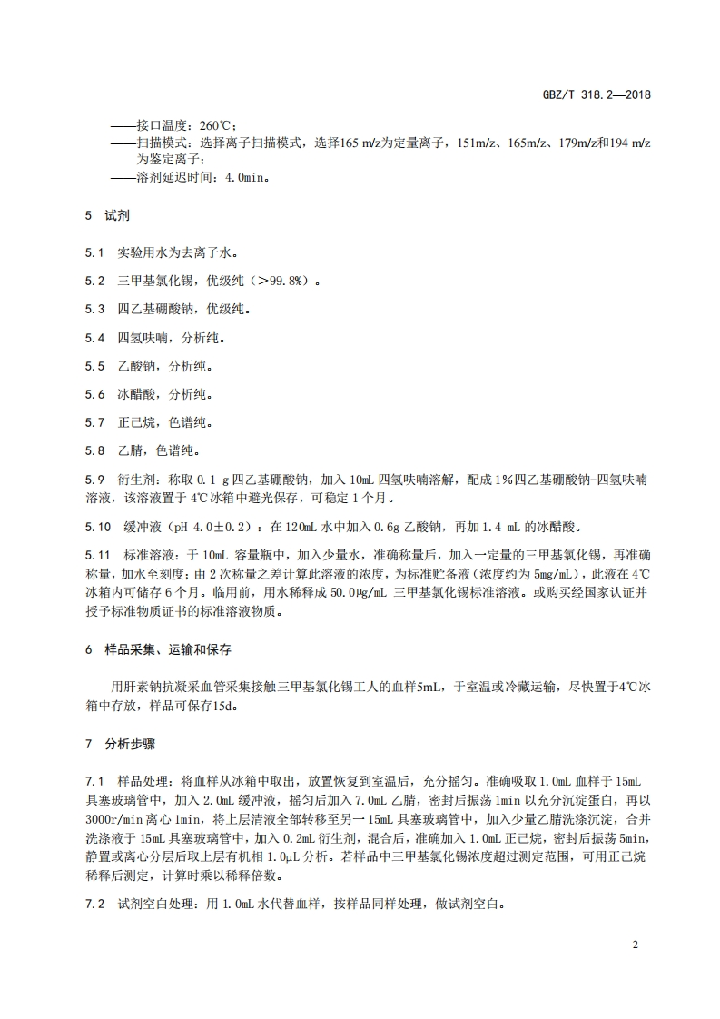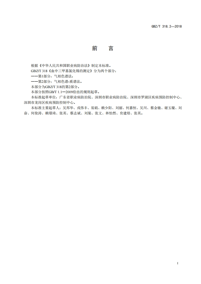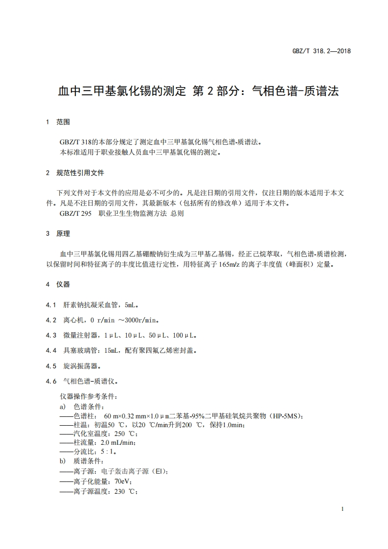 血中三甲基氯化锡的测定第2部分_气相色谱-质谱法Determinationoftrimethyltinchloride(TMT)inbloodPart2_Gaschromatographic-massmethod348072@abc5天前发布关注私信0.40MB6页027血中三甲基氯化锡的测定第2部分_气相色谱-质谱法Determinationoftrimethyltinchloride(TMT)inbloodPart2_Gaschromatographic-massmethod此内容为付费资源,请付费后查看¥13¥19黄金会员免费钻石会员免费立即购买您当前未登录!建议登陆后购买,可保存购买订单付费资源 第1页 / 共6页 第2页 / 共6页 第3页 / 共6页 第4页 / 共6页 第5页 / 共6页 试读已结束,还剩1页,您可下载完整版后进行离线阅读 THE END标准规范 文本预览 ICS13.100C52GBZ中华人民共和国国家职业卫生标准GBZ/T318.2-2018血中三甲基氯化锡的测定第2部分:气相色谱-质谱法Determination of trimethyltin chloride (TMT)in blood-Part 2:Gas chromatographic -mass method2018-08-16发布2019-01-01实施中华人民共和国国家卫生健康委员会发布 查看更多 收起部分 喜欢就支持一下吧收藏