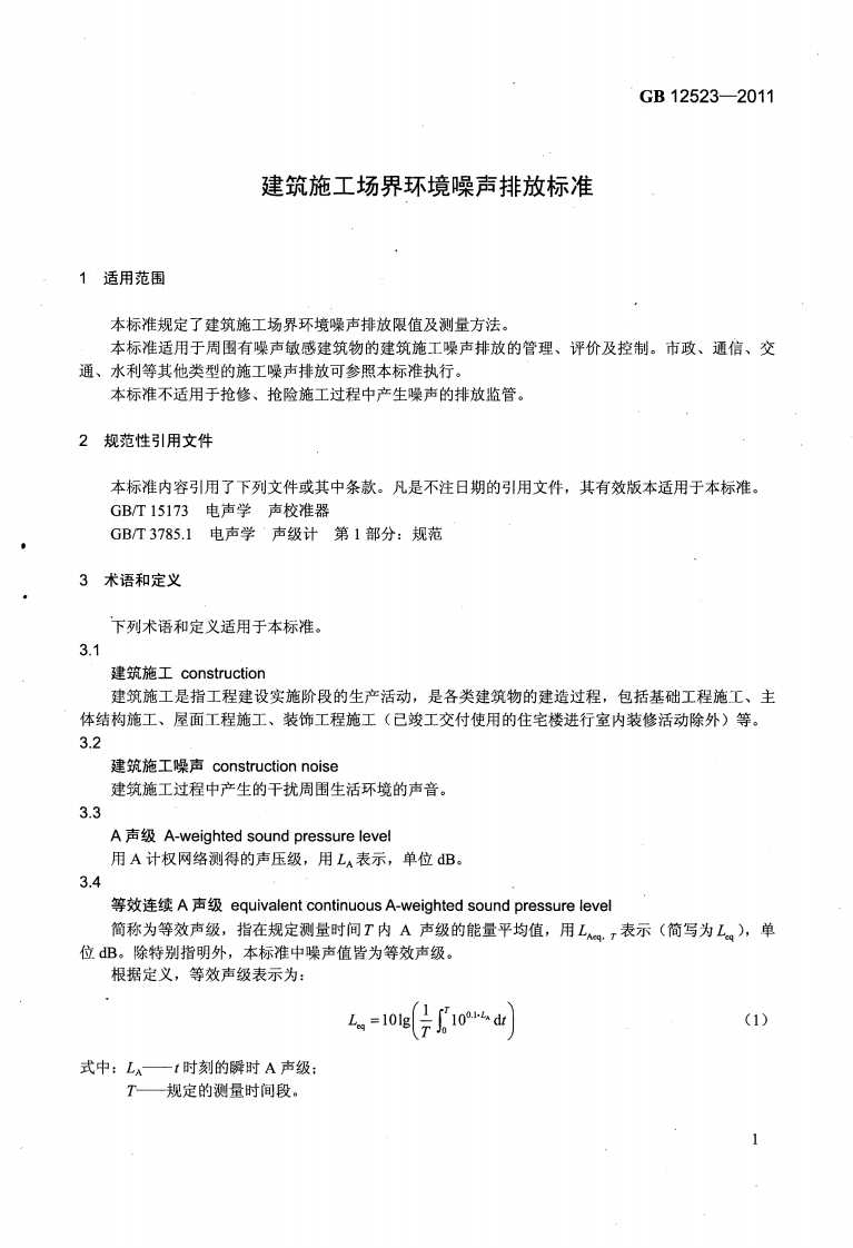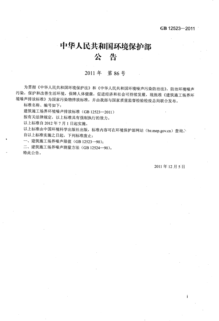 ICS13.140Z52中华人民共和国国家标准GB12523-2011代替GB1252390,GB12524-90建筑施工场界环境噪声排放标准Emission standard of environment noise for boundary of construction site2011-12-05发布2012-07-01实施环境保护邵国家质量监督检验检度总局发布