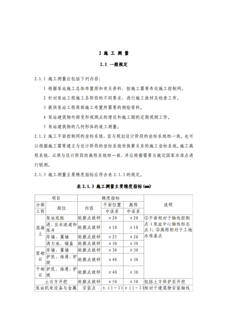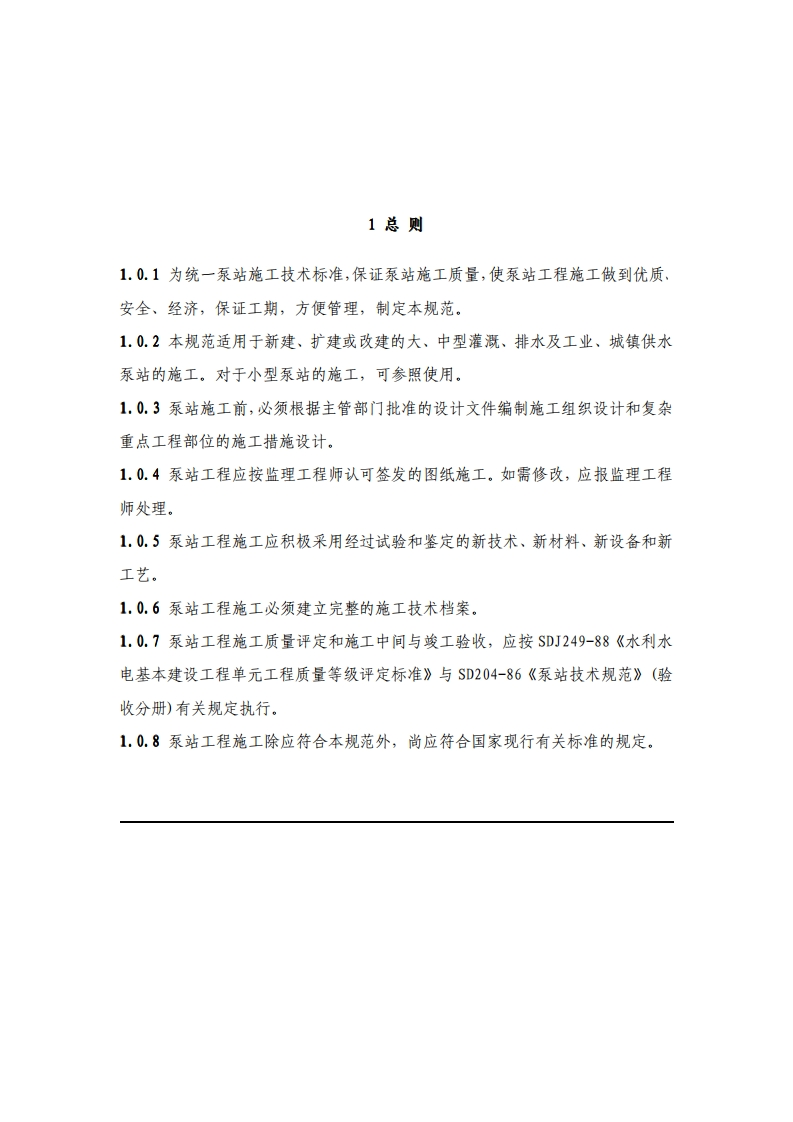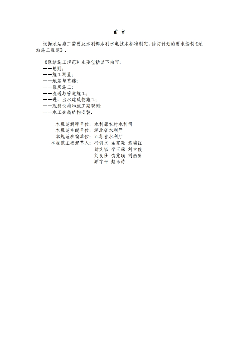 中华人民共和国行业标准泵站施工规范Construction Code For Pumping Station$L234-1999主编单位:湖北省水利厅批准部门:中华人民共和国水利部1999-03-23发布1999-04-01实施中华人民共和国水利部关于批准发布《泵站施工规范》SL234-1999的通知水国科[1999]117号根据水利部水利水电技术标准制定、修订计划,由水利部农村水利司主持,以湖北省水利厅为主编单位制定的《泵站施工规范》,经审查批准为水利行业标准,并予以发布。标准的名称和编号为:《泵站施工规范》SL234-1999本标准自1999年4月1日起实施。在实施过程中,请各单位注意总结经验,如有问题请函告主持部门,并由其负责解释。标准文本由中国水利水电出版社出版发行。一九九年三月二十三日