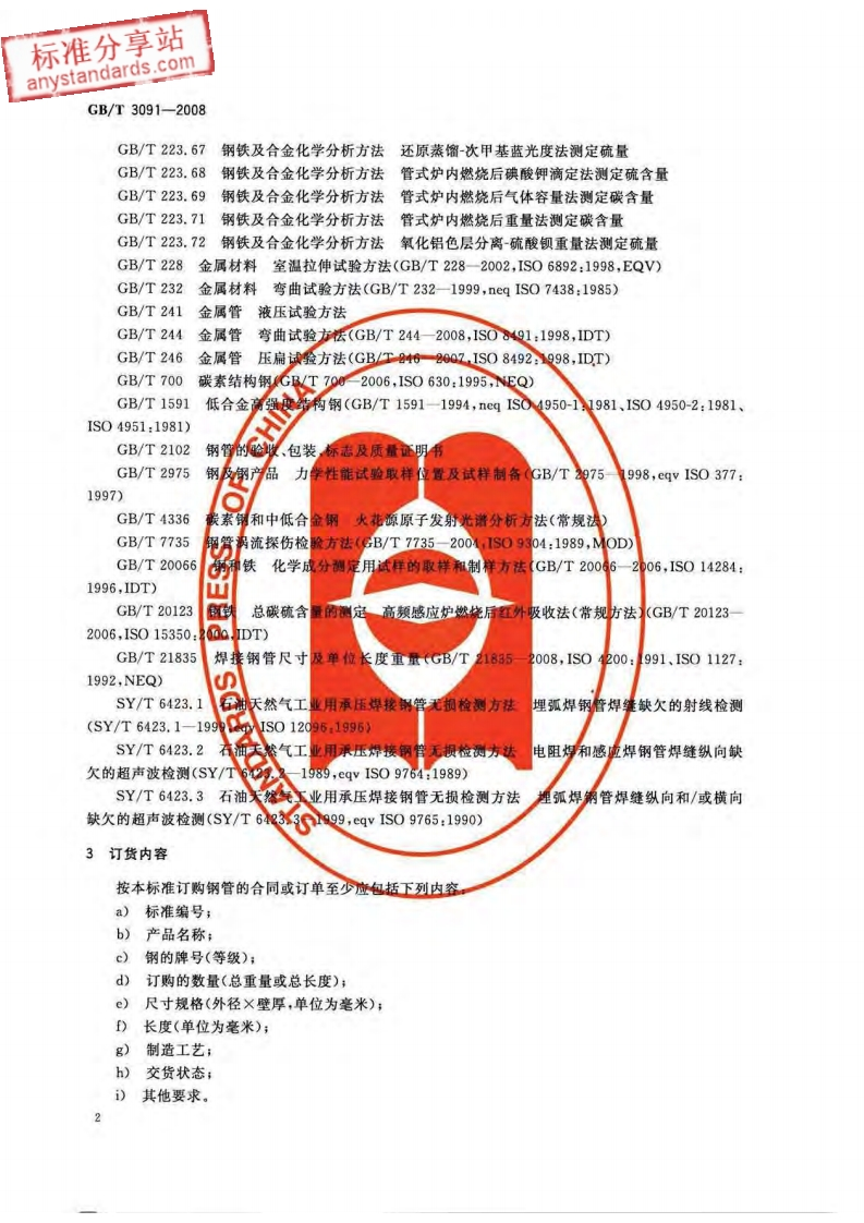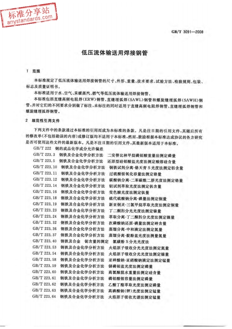标准分享站anystandards.com中华人民共和国国家标准GB/T3091-2008代替GB/T3091-2001低压流体输送用焊接钢管Welded steel pipes for low pressure liquid delivery(IS0559:1991,NEQ)2008-05-13发布2008-11-01实施中华人民共和国国家质量监督检验检疫总局中国国家标准化管理委员会发布