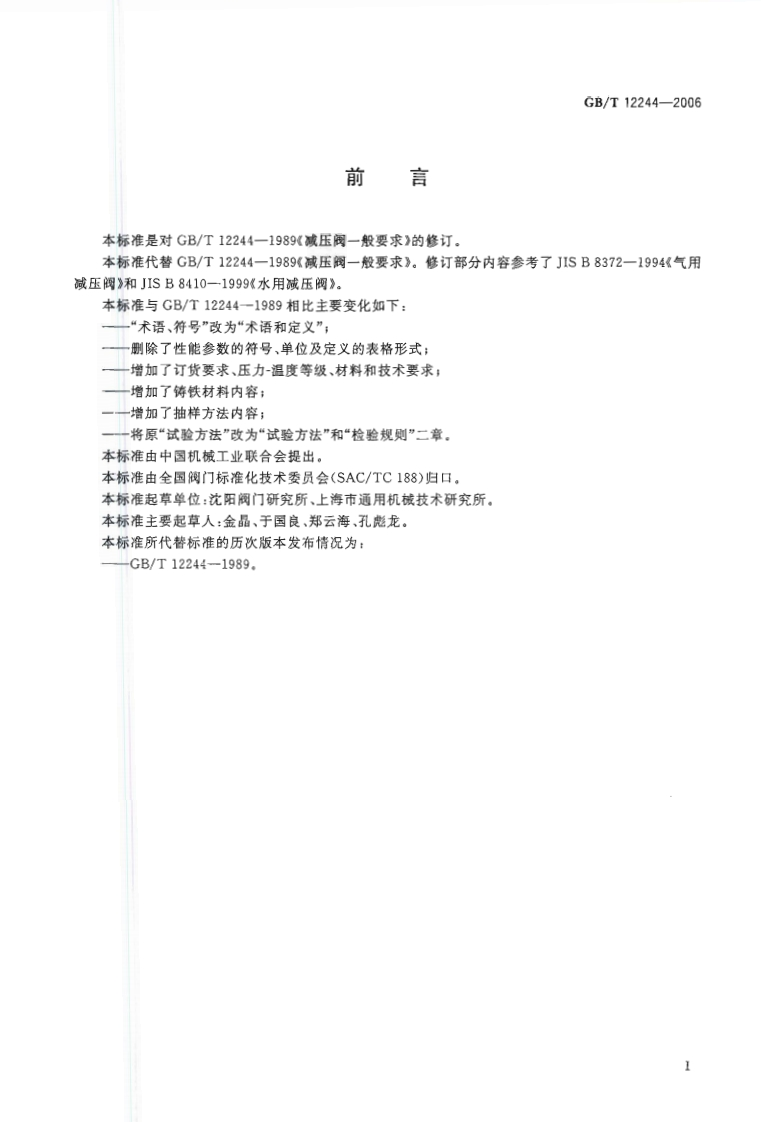 减压阀一般要求Generalrequirementsforpressurereducingvalves348072@abc9天前发布关注私信0.63MB7页023减压阀一般要求Generalrequirementsforpressurereducingvalves此内容为付费资源,请付费后查看¥13¥19黄金会员免费钻石会员免费立即购买您当前未登录!建议登陆后购买,可保存购买订单付费资源 第1页 / 共7页 第2页 / 共7页 第3页 / 共7页 第4页 / 共7页 第5页 / 共7页 试读已结束,还剩2页,您可下载完整版后进行离线阅读 THE END标准规范 文本预览 I1Cs23.060.99J16中华人民共和国国家标准GB/T12244-2006代替GB/T12244-1989减压阀一般要求General requirements for pressure reducing valves2006-12-25发布2007-05-01实施中华人民共和国国家质量监督检验检疫总局中国国家标准化管理委员会发布 查看更多 收起部分 喜欢就支持一下吧收藏