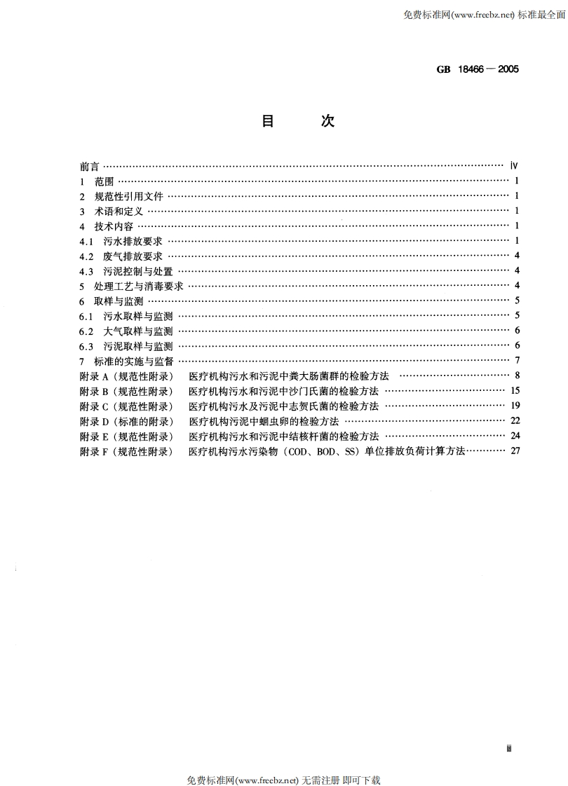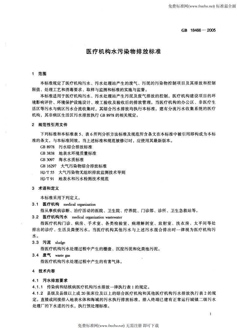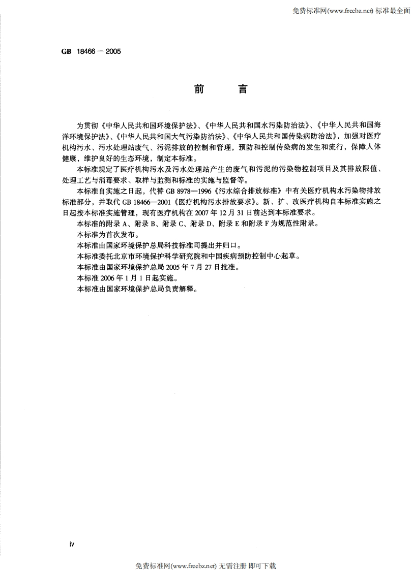 免费标准网(www.reebz.ne)标准最全面ICS13.060.30Z60中华人民共和国国家标准GB18466-2005代替GB18466-2001部分代替GB8978一1996医疗机构水污染物排放标准Discharge standard of water pollutants for medical organization2005-07-27发布2006-01-01实施国家环境保护总局发布生岳县k拟必△必成县免费标准网(www.freebz.net)无需注册即可下载