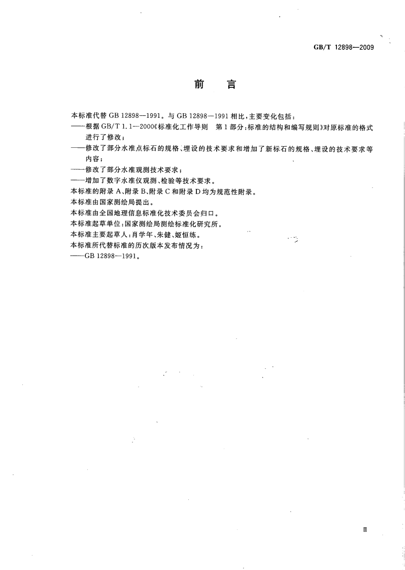 国家三、四等水准测量规范Specificationsforthethirdandfourthorderleveling348072@abc9天前发布关注私信2.50MB65页038国家三、四等水准测量规范Specificationsforthethirdandfourthorderleveling此内容为付费资源,请付费后查看¥13¥19黄金会员免费钻石会员免费立即购买您当前未登录!建议登陆后购买,可保存购买订单付费资源 第1页 / 共65页 第2页 / 共65页 第3页 / 共65页 第4页 / 共65页 第5页 / 共65页 试读已结束,还剩60页,您可下载完整版后进行离线阅读 THE END标准规范 文本预览 1CS07.040A76GB中华人民共和国国家标准GB/T12898一2009代替GB12898-1991国家三、四等水准测量规范Specifications for the third and fourth order leveling2009-05-06发布2009-10-01实施中华人民共和国国家质量监督检验检疫总局数码防伪中国国家标准化管理委员会发布 查看更多 收起部分 喜欢就支持一下吧收藏