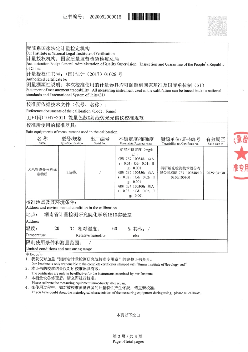 湖南省计量检测研究院Hunan Institute of Metrology and Test校准证书Calibration Certificate证书编号:Certificate No.2020092909015委托单位西安佳谱电子科技有限公司Applicant器具名称能量色散X射线荧光光谱仪Name of Instrument型号/规格XR700Type/Specificati出厂编号XR202007090043Serial No.制造单位Z-SPEC校Manufacturer接收日期2020-09-28Date of Acceptance批准人Approved by拉如专用章之核验员Checked by疹克校准员校准专用章Calibrated by榄校准日期2020年09月29日Calibration DateYear Month Day发布日期2020年09月29日Release DateYear Month Day地址:长沙市香樟路396号电话/传真:0731-85581751/85687602AddressTelephone邮编:410014电子邮件:jszb8hnjly..cnPost CodeEmail第1页/共3页Page oftotal pages