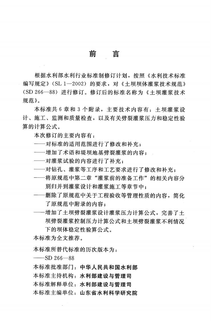 土坝灌浆技术规范Technicalspecificationofearthdamgrouting07-03发布2014-10-03实施348072@abc9天前发布关注私信10.99MB51页028土坝灌浆技术规范Technicalspecificationofearthdamgrouting07-03发布2014-10-03实施此内容为付费资源,请付费后查看¥13¥19黄金会员免费钻石会员免费立即购买您当前未登录!建议登陆后购买,可保存购买订单付费资源 第1页 / 共51页 第2页 / 共51页 第3页 / 共51页 第4页 / 共51页 第5页 / 共51页 试读已结束,还剩46页,您可下载完整版后进行离线阅读 THE END标准规范 文本预览 ICS93.160P55中华人民共和国水利行业标准SL564-2014替代SD266一88土坝灌浆技术规范Technical specification of earth dam grouting2014-07-03发布2014-10-03实施中华人民共和国水利部发布82超8 查看更多 收起部分 喜欢就支持一下吧收藏