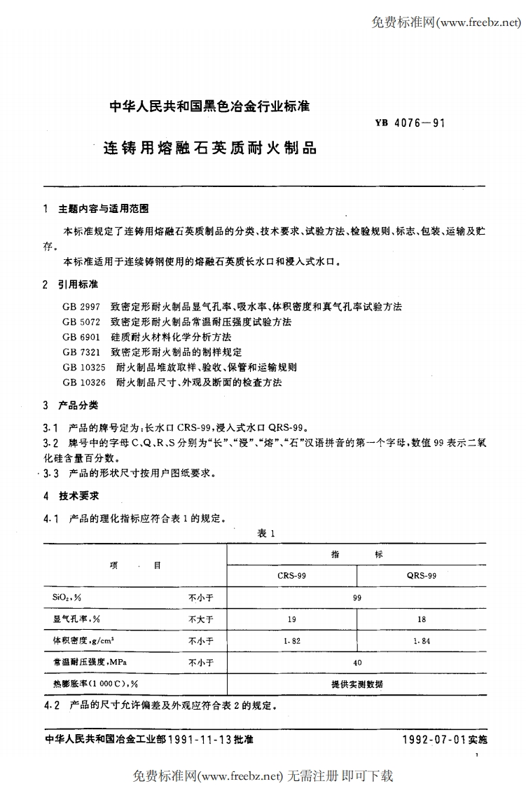 YBT-4076-1991-连铸用熔融石英质耐火制品348072@abc2个月前发布关注私信70.20KB4页02815YBT-4076-1991-连铸用熔融石英质耐火制品此内容为付费资源,请付费后查看¥17¥32黄金会员免费钻石会员免费立即购买您当前未登录!建议登陆后购买,可保存购买订单付费资源 第1页 / 共4页 第2页 / 共4页 试读已结束,还剩2页,您可下载完整版后进行离线阅读 © 版权声明文章版权归作者所有,未经允许请勿转载。THE END标准规范 文本预览 免费标准网(www.freebz.ne中华人民共和国黑色治金行业标准YB4076-91连铸用熔融石英质耐火制品1991-11-13发布1992-07-01实施中华人民共和国冶金工业部发布免费标准网(www.freebz.ne)无需注册即可下载 查看更多 收起部分 喜欢就支持一下吧点赞15 分享QQ空间微博QQ好友海报分享复制链接收藏