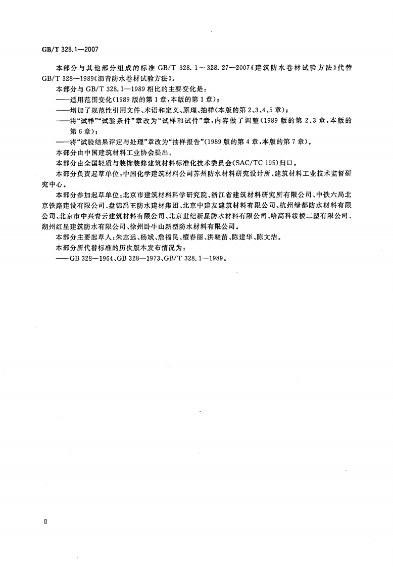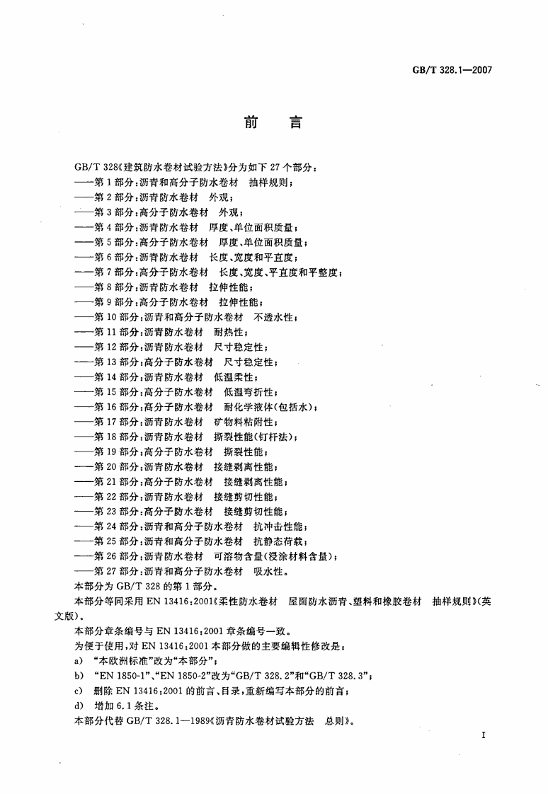 1Cs91.120.30Q17中华人民共和国国家标准GB/T328.1一2007代替GB/T328.1一1989建筑防水卷材试验方法第1部分:沥青和高分子防水卷材抽样规则Test methods for building sheets for waterproofing-Part 1:Bitumen,plastic and rubber sheets for waterproofing-rules for sampling2007-03-26发布2007-10-01实施中华人民共和国国家质量监督检验检疫总局中国国家标准化管理委员会发布、拉