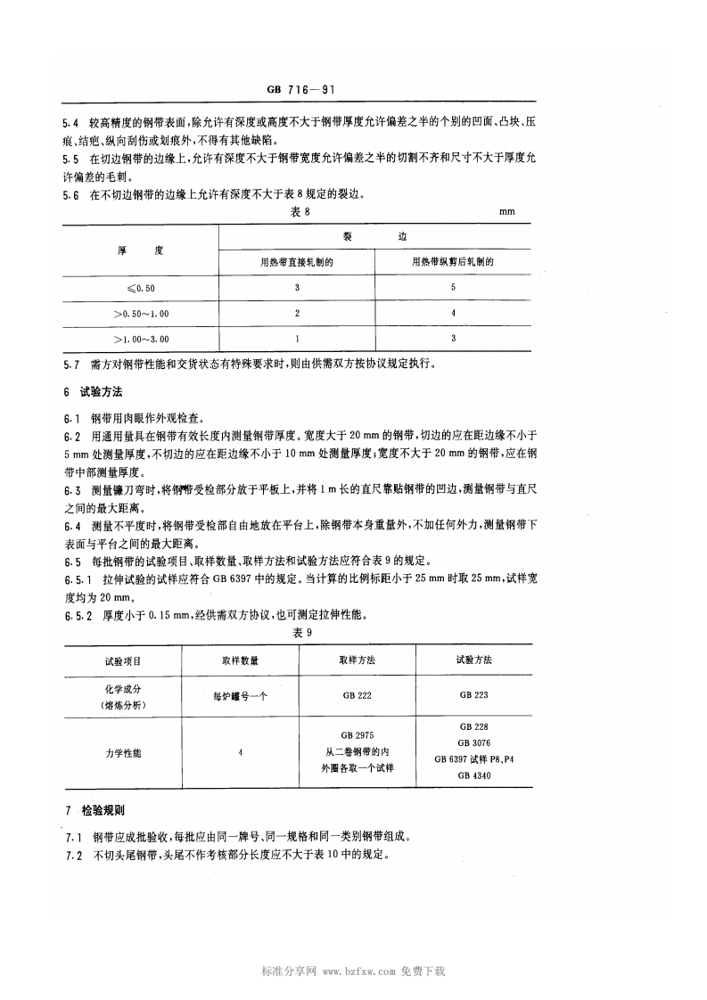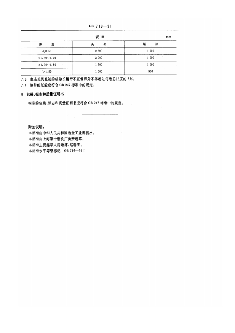 中华人民共和国国家标准GB716-91碳素结构钢冷轧钢带代替GB716—83Cold-rolled carbon structural steel strips1主题内容与适用范围本标准规定了碳素结构钢冷轧钢带(以下简称钢带)的尺寸、外形、技术要求、试验方法、检验规则、包装、标志和质量证明书。本标准适用于冷轧机制造的成卷钢带。2引用标准GB222钢的化学分析用试样取样法及成品化学成分允许偏差GB223钢铁及合金化学分析方法GB228金属拉伸试验方法GB247钢板和钢带验收,包装,标志及质量证明书的一般规定GB700碳素结构钢GB2975钢材力学及工艺性能试验取样规定GB3076金属薄板(带)拉伸试验方法GB4340金属维氏硬度试验方法GB6397金属拉伸试验试样3分类,代号3.1钢带按尺寸精度分为:普通精度钢带P宽度较高精度钢带K厚度较高精度钢带少宽度、厚度较高精度钢带KH3.2钢带按表面精度分为:普通精度表面钢带较高精度表面钢带n3.3钢带按边缘状态分为:切边钢带不切边钢带BQ3.4钢带按力学性能分为:软钢带R半软钢带BR硬钢带Y国家技术监督局1991-03-26批准1991-11-01实施
