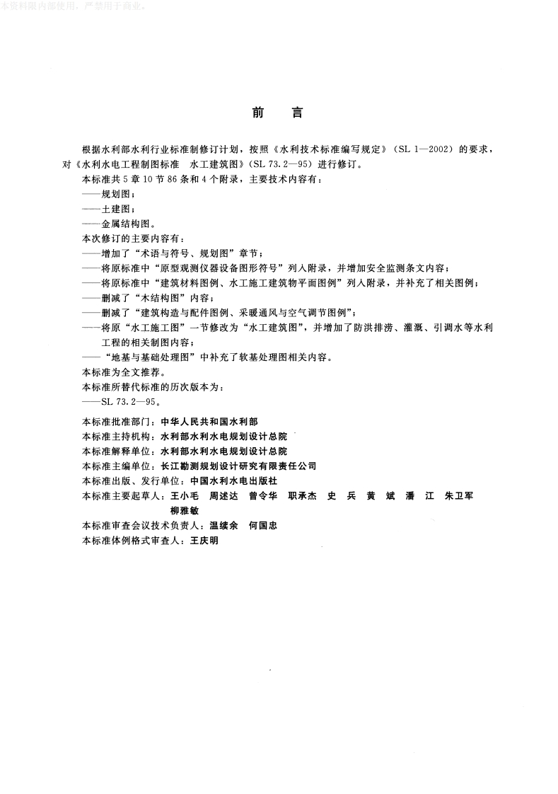 本资料限内部使用,严禁用于商业ICS01.100A01SL中华人民共和国水利行业标准SL73.2-2013替代SL73.2-95水利水电工程制图标准水工建筑图Drawing standard of water resources and hydroelectricengineering for hydraulic construction drawing2013-01-14发布2013-04-14实施中华人民共和国水利部发布