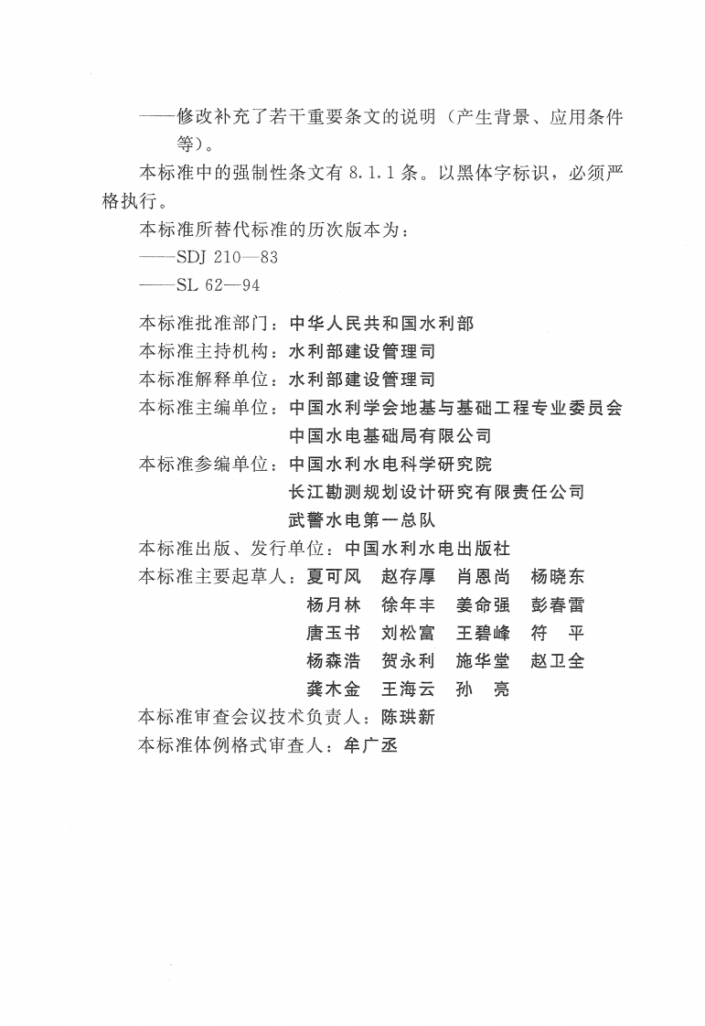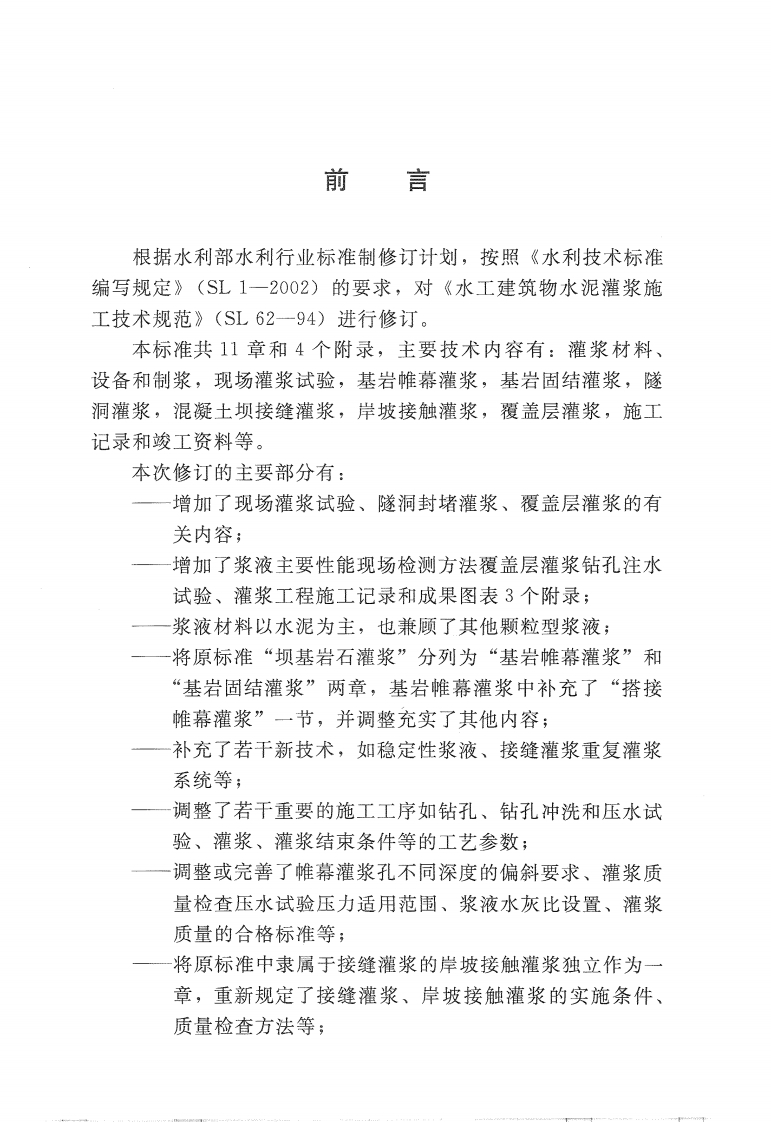 水上建筑物水泥准浆他上坟入规汇Technicalspecificationforcementgroutingofhydraulicstructures4-10-27发布2015-01-27实施348072@abc12天前发布关注私信12.65MB190页047水上建筑物水泥准浆他上坟入规汇Technicalspecificationforcementgroutingofhydraulicstructures4-10-27发布2015-01-27实施此内容为付费资源,请付费后查看¥13¥19黄金会员免费钻石会员免费立即购买您当前未登录!建议登陆后购买,可保存购买订单付费资源 第1页 / 共190页 第2页 / 共190页 第3页 / 共190页 第4页 / 共190页 第5页 / 共190页 试读已结束,还剩185页,您可下载完整版后进行离线阅读 THE END标准规范 文本预览 ICS27.140P55SL中华人民共和国水利行业标准SL62-2014替代SL62-94水工建筑物水泥灌浆施工技术规范Technical specification for cement groutingof hydraulic structures2014-10-27发布2015-01-27实施中华人民共和国水利部发布 查看更多 收起部分 喜欢就支持一下吧收藏