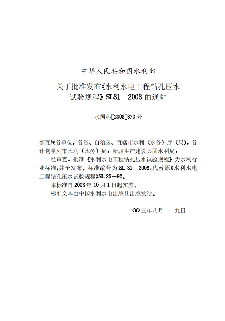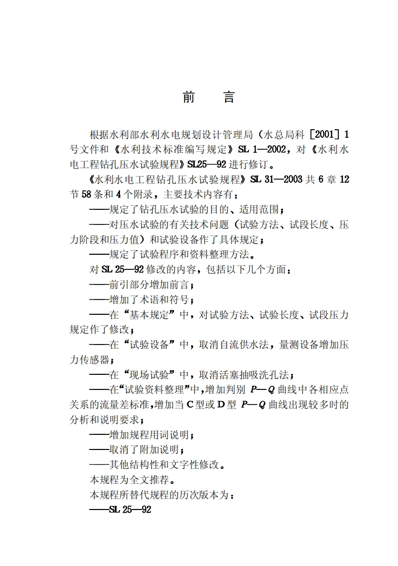 水利水电工程钻孔压水试验规程Codeofwaterpressuretestinboreholeforwaterresourcesandhydropowerengineering348072@abc15天前发布关注私信0.47MB25页045水利水电工程钻孔压水试验规程Codeofwaterpressuretestinboreholeforwaterresourcesandhydropowerengineering此内容为付费资源,请付费后查看¥13¥19黄金会员免费钻石会员免费立即购买您当前未登录!建议登陆后购买,可保存购买订单付费资源 第1页 / 共25页 第2页 / 共25页 第3页 / 共25页 第4页 / 共25页 第5页 / 共25页 试读已结束,还剩20页,您可下载完整版后进行离线阅读 THE END标准规范 文本预览 1cs93.160P13中华人民共和国水利行业标准SL31—2003替代$L25一92水利水电工程钻孔压水试验规程Code of water pressure test in borehole for waterresources and hydropower engineering2003-08-29发布2003-10-01实施中华人民共和国水利部发布 查看更多 收起部分 喜欢就支持一下吧收藏