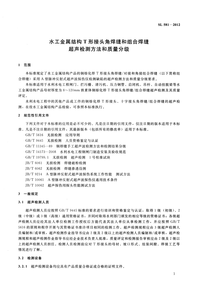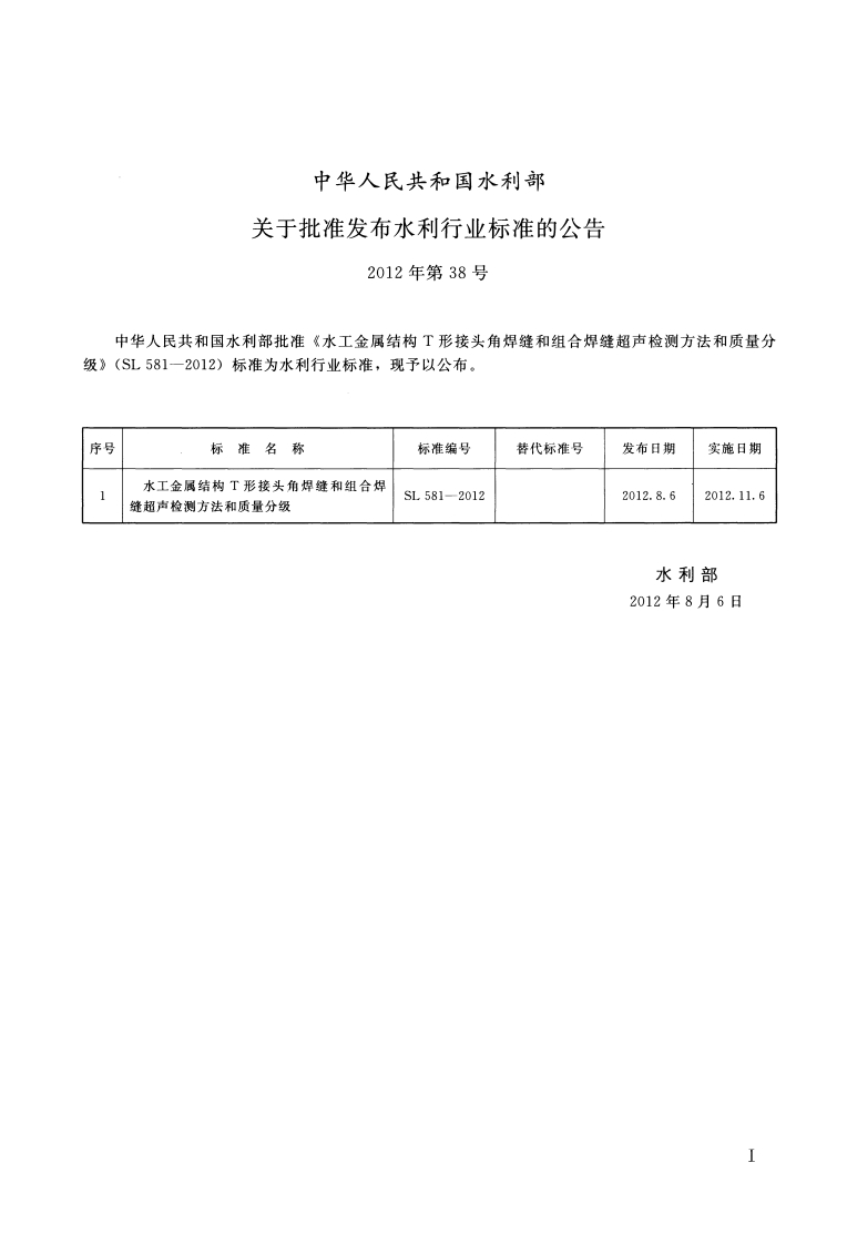 ICS91.080.10P26SL中华人民共和国水利行业标准SL581-2012水工金属结构T形接头角焊缝和组合焊缝超声检测方法和质量分级Ultrasonic testing method and quality classificationfor T-joint fillet welds and combination of butterweld and fillet weld of hydro steel structures2012-08-06发布2012-11-06实施中华人民共和国水利部发布