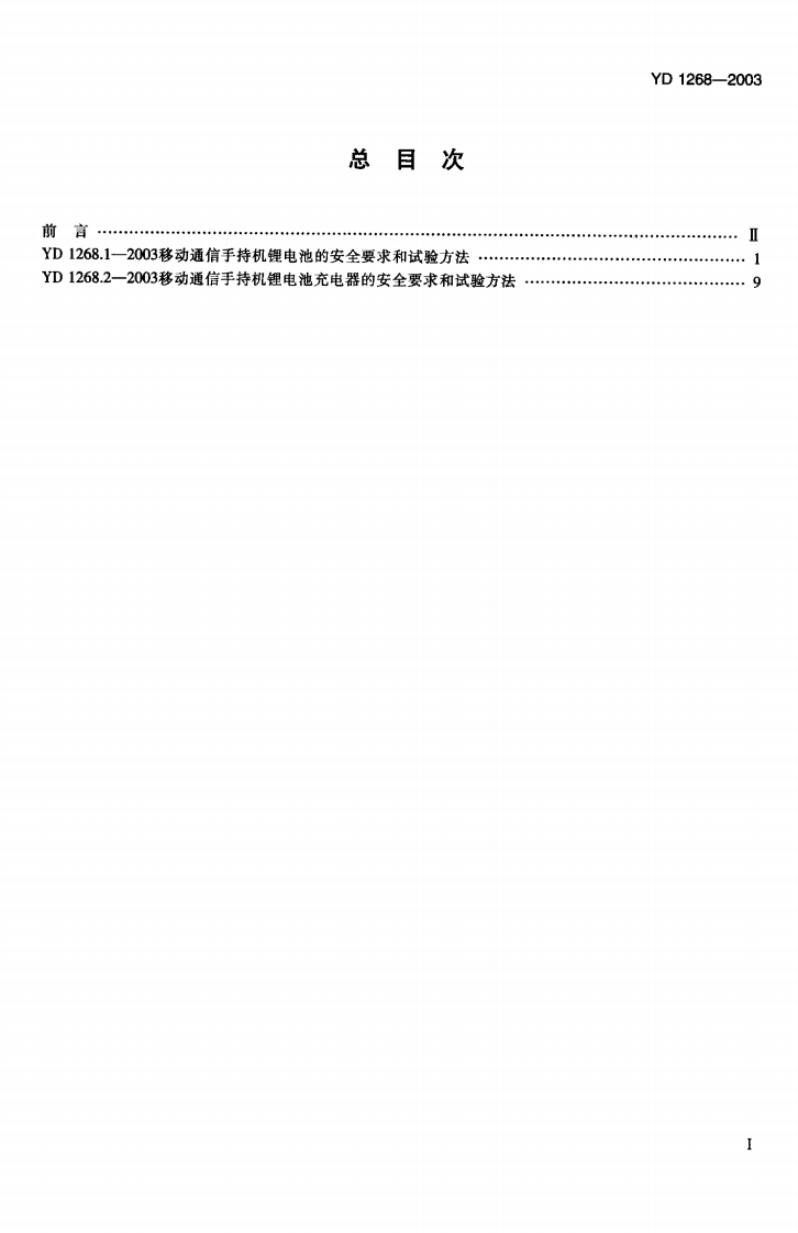 YD1268-2003348072@abc4个月前发布关注私信0.40MB16页029YD1268-2003此内容为付费资源,请付费后查看¥17¥32黄金会员免费钻石会员免费立即购买您当前未登录!建议登陆后购买,可保存购买订单付费资源 第1页 / 共16页 第2页 / 共16页 试读已结束,还剩14页,您可下载完整版后进行离线阅读 THE END标准规范 文本预览 YD中华人民共和国通信行业标准YD1268-2003移动通信手持机锂电池及充电器的安全要求和试验方法The safety specification and test methodfor lithium batteries and charger2003-06-05发布2003-06-05实施中华人民共和国信息产业部发布 查看更多 收起部分 喜欢就支持一下吧收藏
