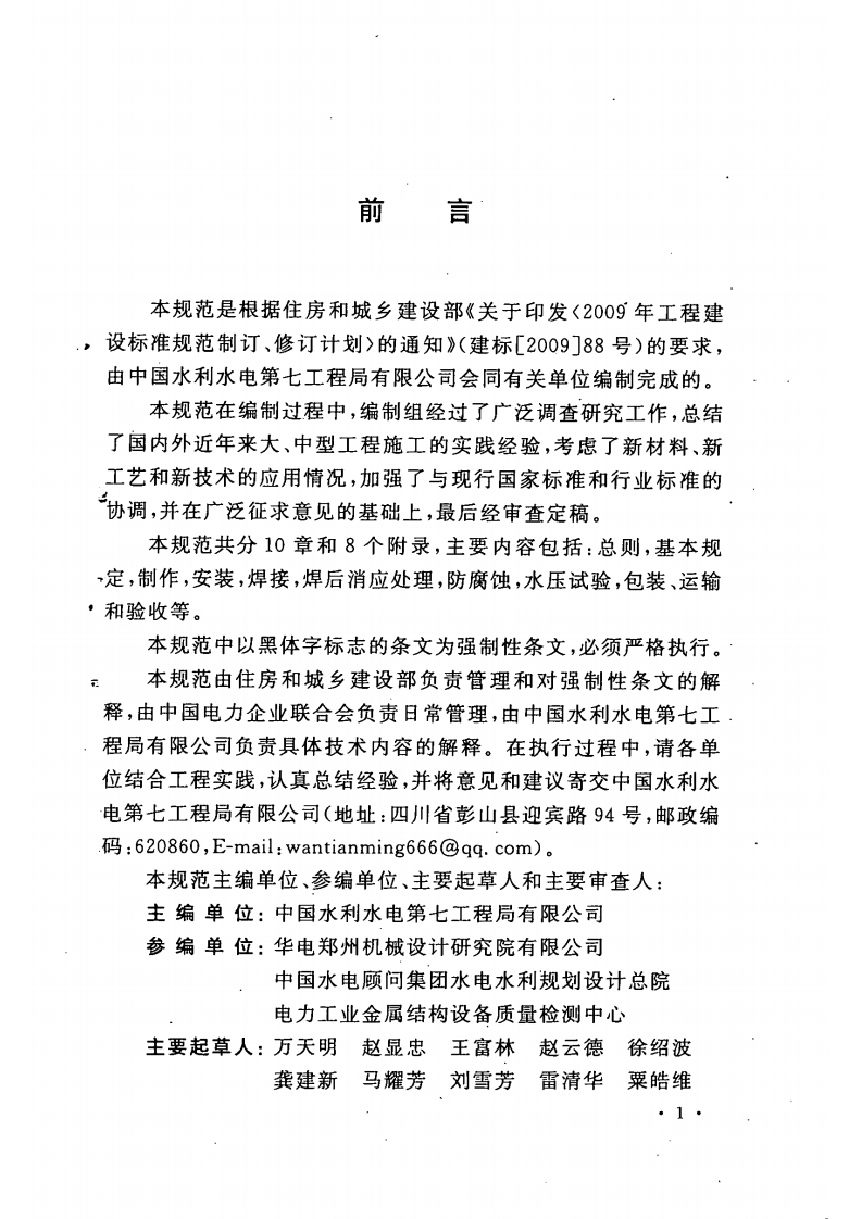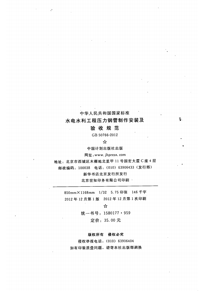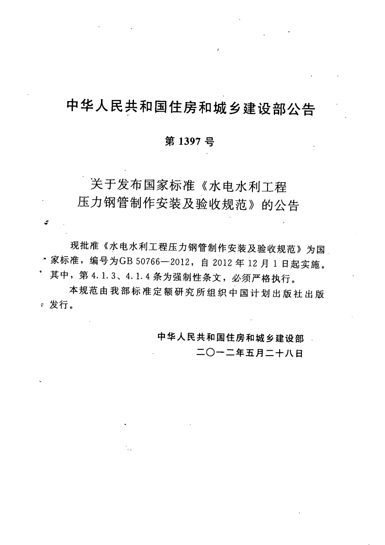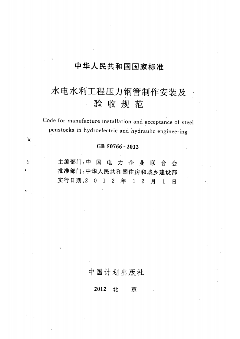 UDS中华人民共和国国家标准PGB50766-2012水电水利工程压力钢管制作安装及验收规范Code for manufacture installation and acceptance of steelpenstocks in hydroelectric and hydraulic engineering入2012-05-28发布2012-12-01实施中华人民共和国住房和城乡建设部联合发布中华人民共和国国家质量监督检验检疫总局