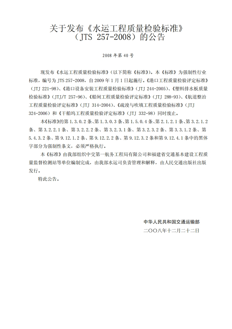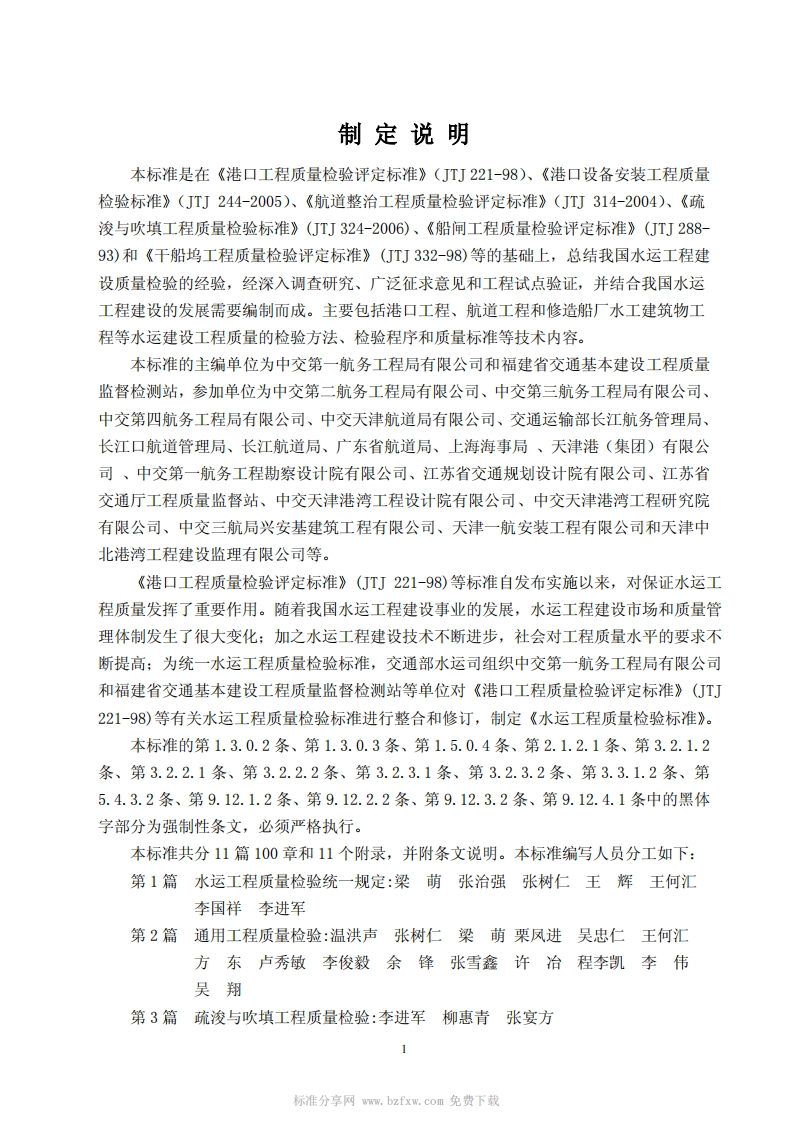 水运工程质量检验标准StandardforQualityInspectionofPortandWaterwayEngineeringConstruction348072@abc15天前发布关注私信5.57MB609页035水运工程质量检验标准StandardforQualityInspectionofPortandWaterwayEngineeringConstruction此内容为付费资源,请付费后查看¥13¥19黄金会员免费钻石会员免费立即购买您当前未登录!建议登陆后购买,可保存购买订单付费资源 第1页 / 共609页 第2页 / 共609页 第3页 / 共609页 第4页 / 共609页 第5页 / 共609页 试读已结束,还剩604页,您可下载完整版后进行离线阅读 THE END标准规范 文本预览 JTS中华人民共和国行业标准JTS257-2008水运工程质量检验标准Standard for Quality Inspection of Port andWaterway Engineering Construction2008-12-22发布2009-01-01实施中华人民共和国交通运输部发布 查看更多 收起部分 喜欢就支持一下吧收藏