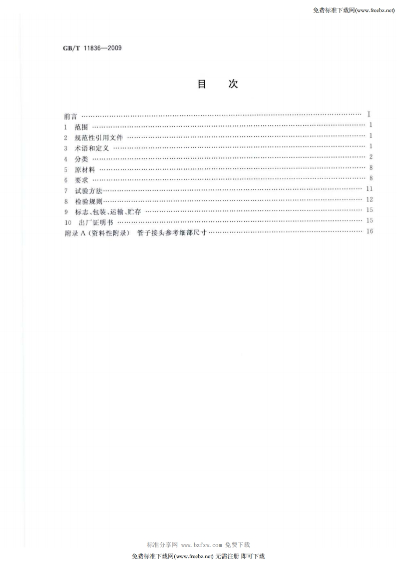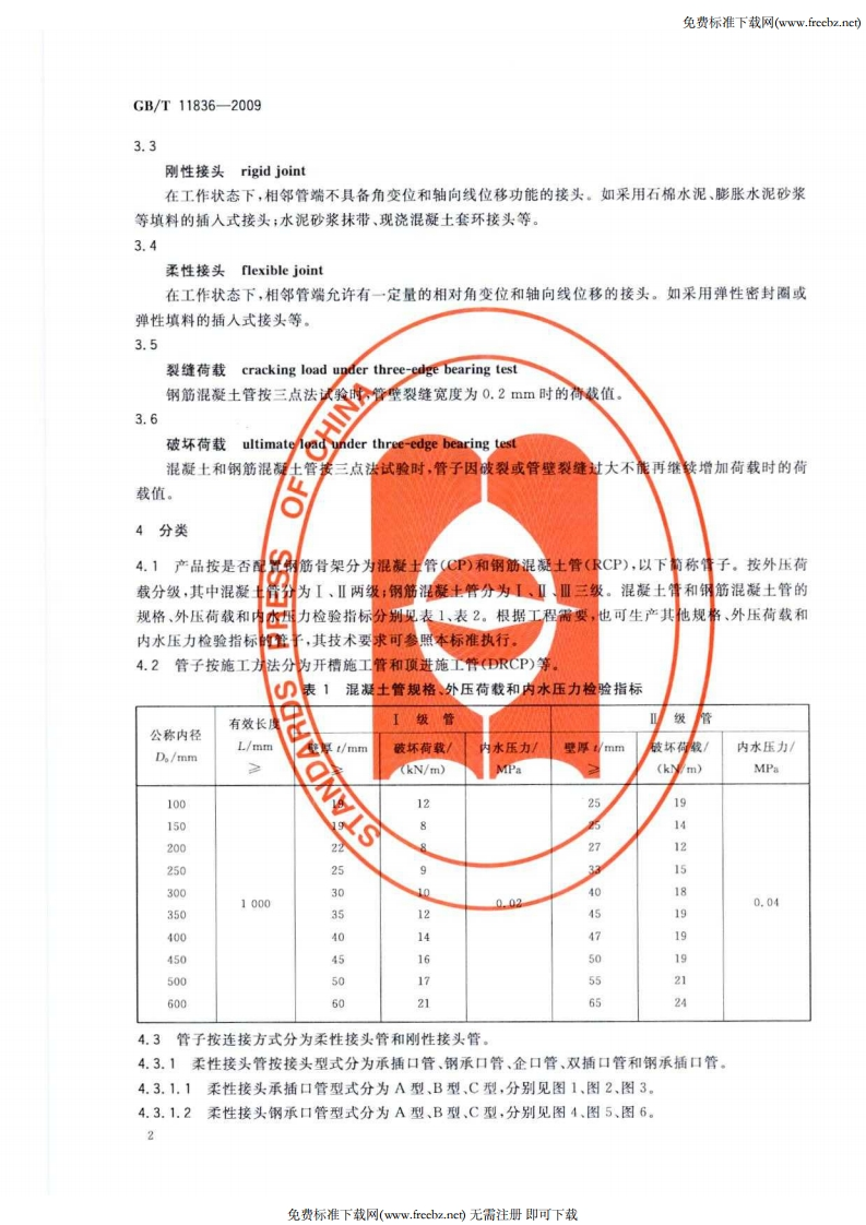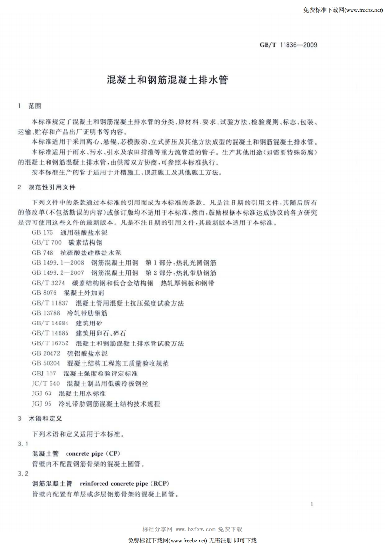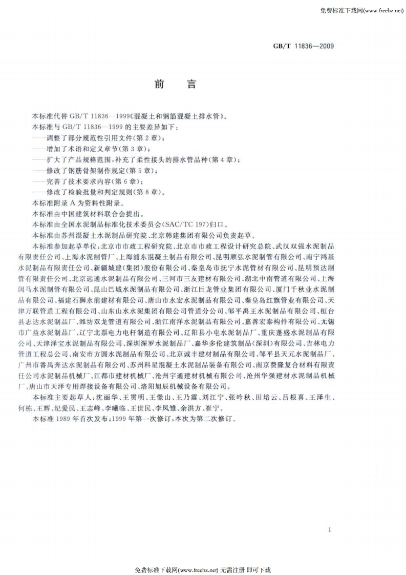 免费标准下载网(www.freebz.nc)1CS91.100.30Q14GB中华人民共和国国家标准GB/T11836-2009代替GB/T11836一1999混凝土和钢筋混凝土排水管Concrete and reinforced concrete sewer pipes资料专用章2009-03-09发布2009-11-05实施中华人民共和国国家质量监督检验检疫总局数码防伪中国国家标准化管理委员会发布免费标准下载网(www.freebz.nc)无需注册即可下载