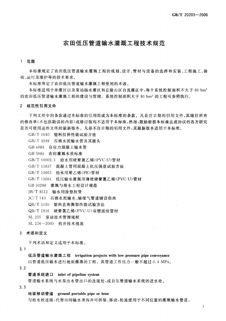 田低压管道输水灌溉工程技术规范Technicalspecificationforirrigationprojectswithlowpressurepipeconveyance348072@abc13天前发布关注私信0.64MB20页047田低压管道输水灌溉工程技术规范Technicalspecificationforirrigationprojectswithlowpressurepipeconveyance此内容为付费资源,请付费后查看¥13¥19黄金会员免费钻石会员免费立即购买您当前未登录!建议登陆后购买,可保存购买订单付费资源 第1页 / 共20页 第2页 / 共20页 第3页 / 共20页 第4页 / 共20页 第5页 / 共20页 试读已结束,还剩15页,您可下载完整版后进行离线阅读 THE END标准规范 文本预览 ICS93.160P57GB中华人民共和国国家标准GB/T20203一2006农田低压管道输水灌溉工程技术规范Technical specification for irrigation projectswith low pressure pipe conveyance2006-02-24发布2006-07-01实施中华人民共和国国家质量监督检验检疫总局中国国家标准化管理委员会发布 查看更多 收起部分 喜欢就支持一下吧收藏