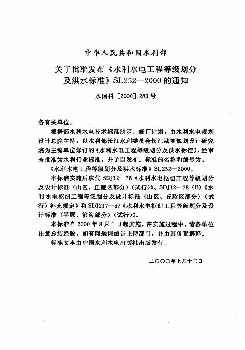 等级划分及洪水标准StandardforClassificationandFloodControofWaterResourcesandHydroelectricProject)-07-13发布2000-08-01实施348072@abc12天前发布关注私信1.84MB39页040等级划分及洪水标准StandardforClassificationandFloodControofWaterResourcesandHydroelectricProject)-07-13发布2000-08-01实施此内容为付费资源,请付费后查看¥13¥19黄金会员免费钻石会员免费立即购买您当前未登录!建议登陆后购买,可保存购买订单付费资源 第1页 / 共39页 第2页 / 共39页 第3页 / 共39页 第4页 / 共39页 第5页 / 共39页 试读已结束,还剩34页,您可下载完整版后进行离线阅读 THE END标准规范 文本预览 UDCL中华人民共和国行业标准PSL252-2000水利水电工程等级划分及洪水标准Standard for Classification and Flood Controlof Water Resources and Hydroelectric Project2000-07-13发布2000-08-01实施中华人民共和国水利部发布 查看更多 收起部分 喜欢就支持一下吧收藏