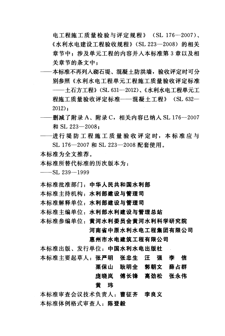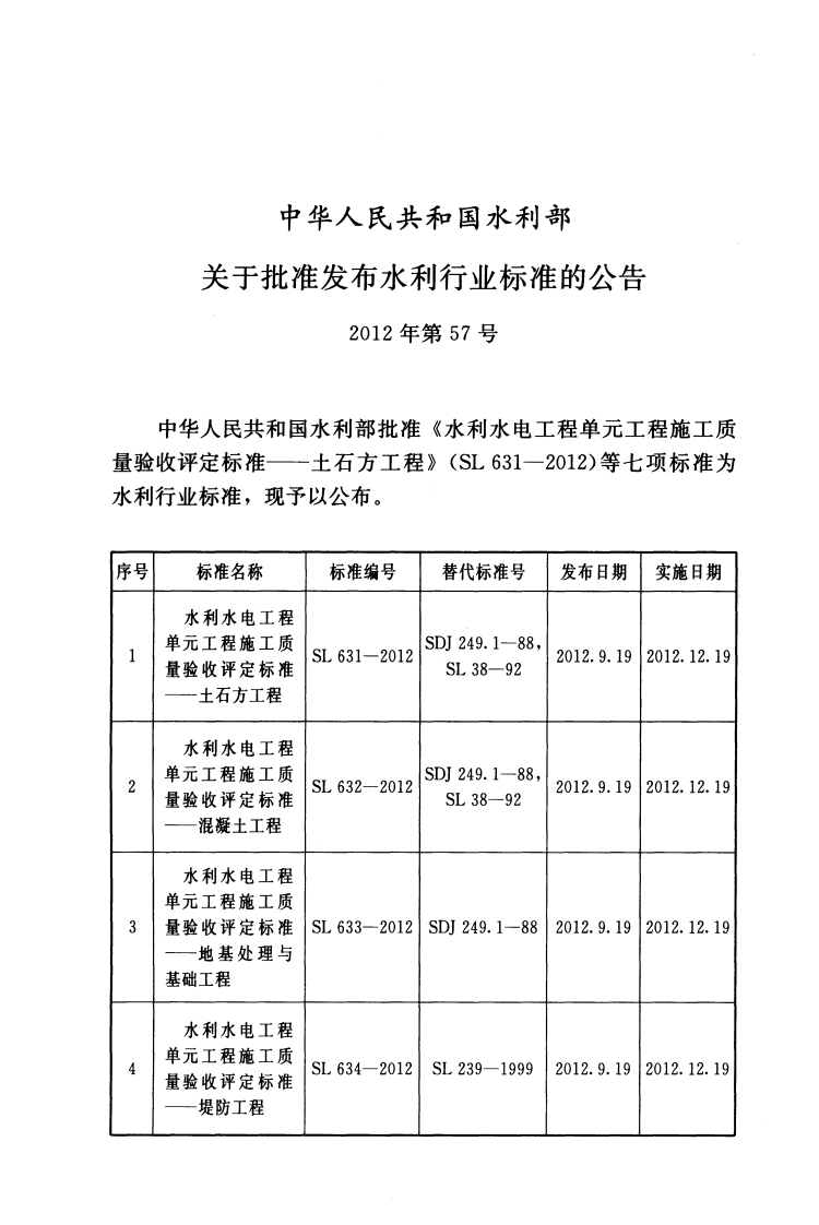 ICS27.140P55SL中华人民共和国水利行业标准SL634-2012替代SL239一1999水利水电工程单元工程施工质量验收评定标准一堤防工程Inspection and assessment standard for separated itemproject construction quality of water conservancyand hydroelectric engineering-Levee works2012-09-19发布2012-12-19实施中华人民共和国水利部发布