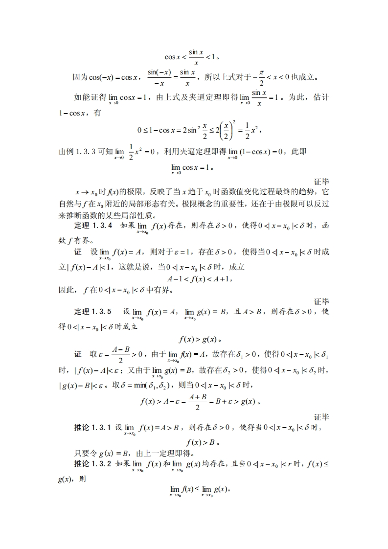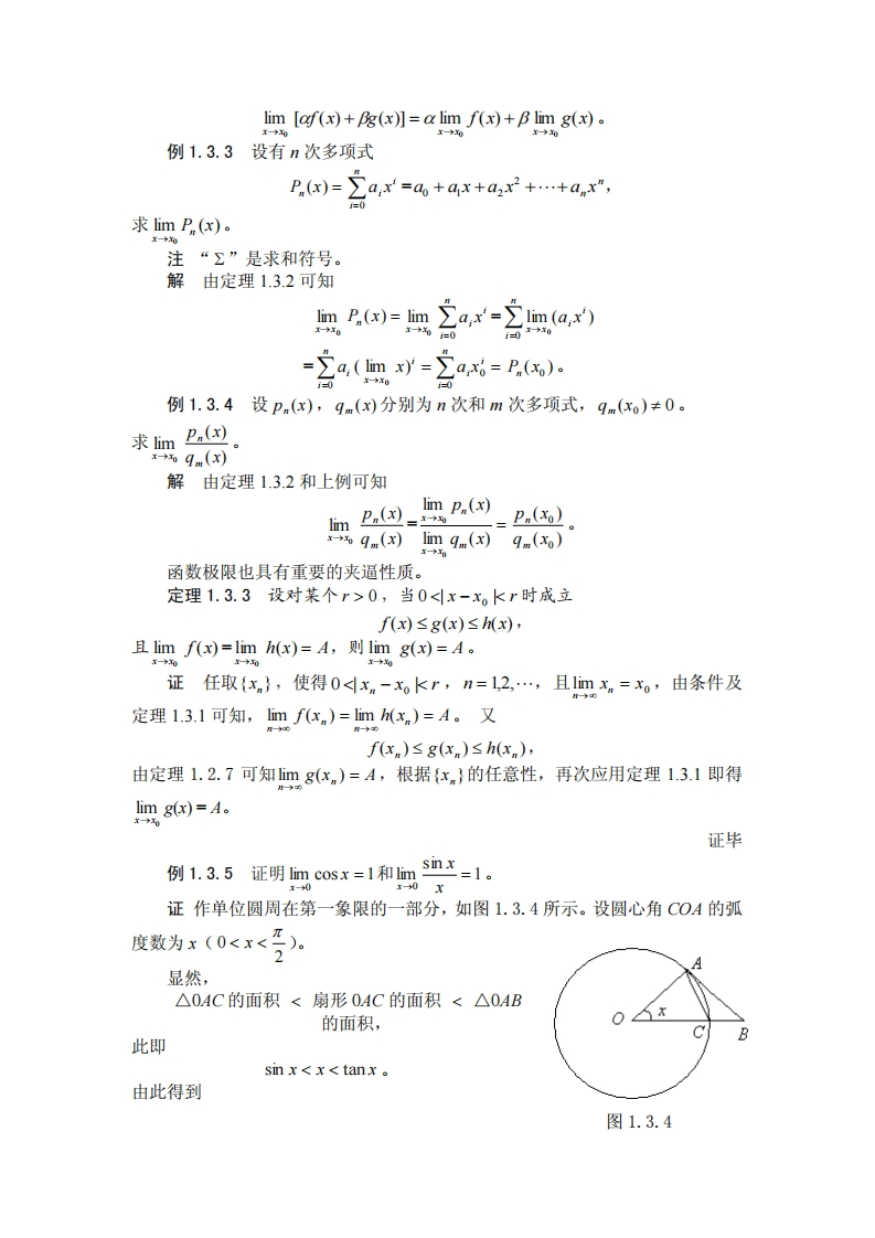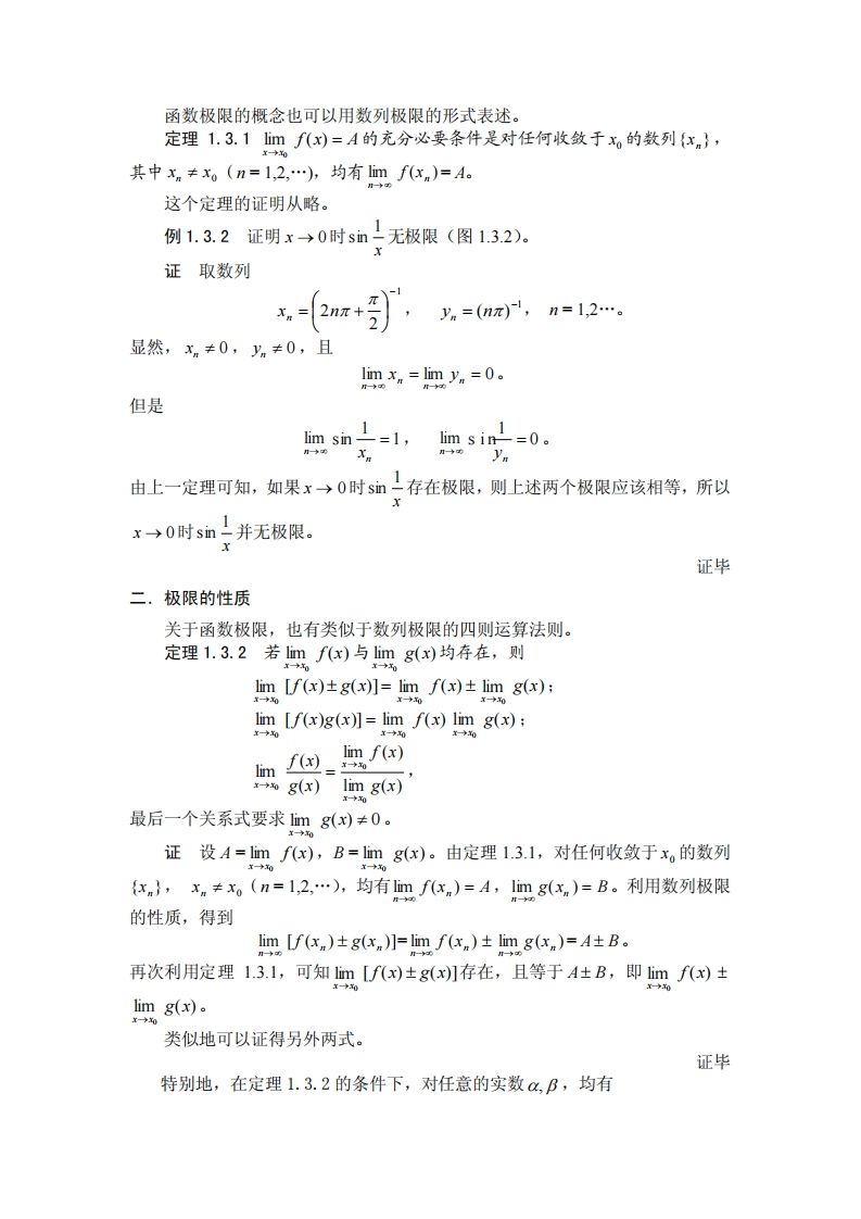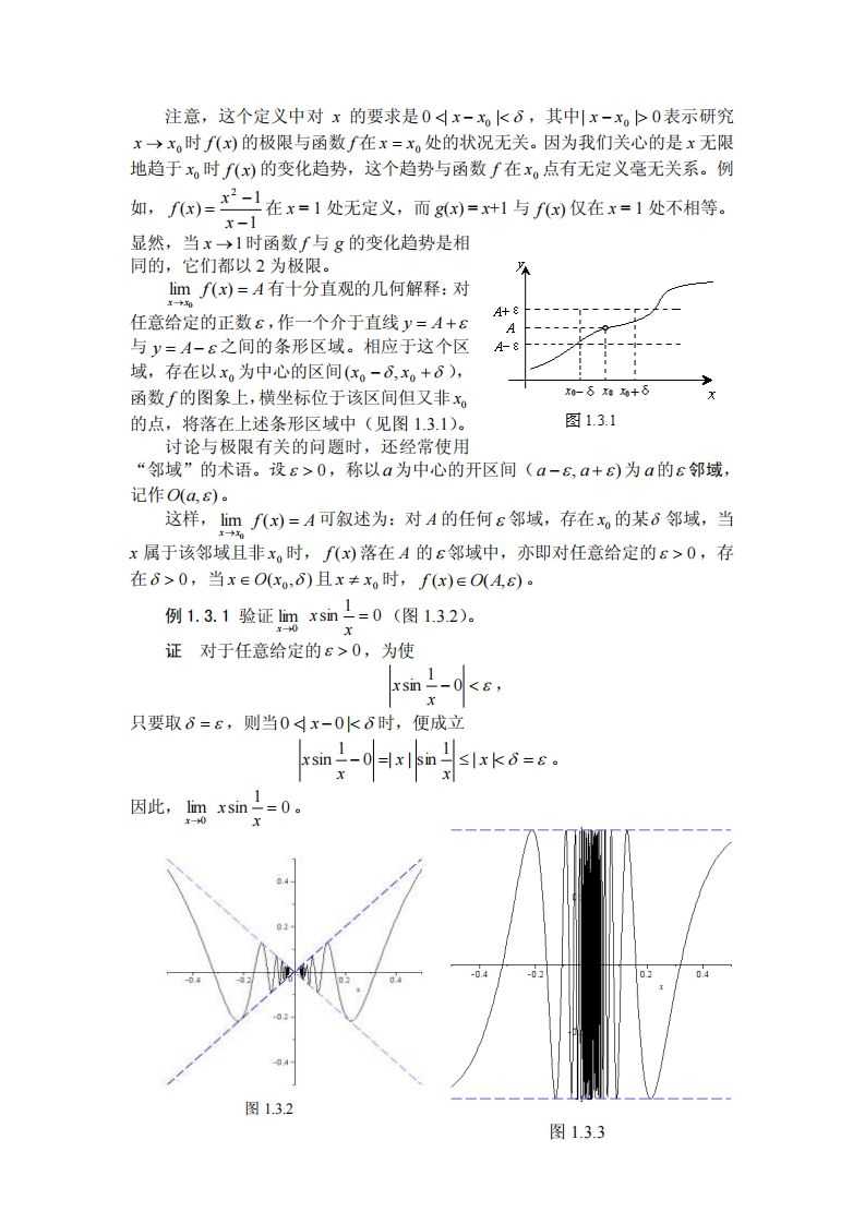 函数的极限教学内容极限理论是微积分学的基础,极限的概念与思想方法始终贯穿于微积分之中,是研究函数变化特征的一个重要工具。对于自变量的变化过程中相应函数值变化趋势的讨论,引出了函数极限的概念。由于自变量变化过程不同,函数的极限表现为不同的形式,而数列极限就是定义在正整数集上的函数当自变量趋于无穷大时的极限。在这节中主要讲解以下几方面的内容:(1)自变量分别趋于有限值和趋于无限时,函数的极限的概念。单侧极限的概念:(2)函数极限的性质,函数极限的计算:(3)函数极限与数列极限的关系:(4)两个重要极限:limr-0sinx=1和1im教学思路和要求(1)极限的概念的理解是一元微分学学习中的一个难点,学生们往往对极限的严格定义以及如何利用该定义来说明问题感到无所适从,更谈不上如何去灵活运用。继数列极限之后,这部分内容还是要进一步引导学生理解极限概念的深刻含义,看清它的本质,掌握运用他们处理问题的能力:(2)极限的概念、极限的性质、函数极限与数列极限的关系以及两个重要极限是本节内容的重点:(3)要使学生理解函数极限与数列极限的关系,并能运用它说明某些函数极限不存在:(4)运用极限的性质,计算一些函数的极限,加深对这些性质的理解:(5)利用两个重要极限imsmx-1和m1+》=e来处理其他相关极限的技巧也是一个必须要掌握的内容。教学安排一,自变量趋于有限值时函数的极限首先考虑自变量x趋向x。的过程中函数值的变化趋势。设函数f在x。附近有定义,如果在x趋于x。的过程中,函数值f(x)无限地接近于常数A,即f(x)-A趋于0,就称A是f(x)当x→x。时的极限,它的精确数学描述如以下定义。定义1.3.1如果对任意给定的8>0,总存在6>0,使得0x-xoK6时成立f(x)-Aks,则称f(x)在x→x。时以A为极限,记作limf(x)=A。→0