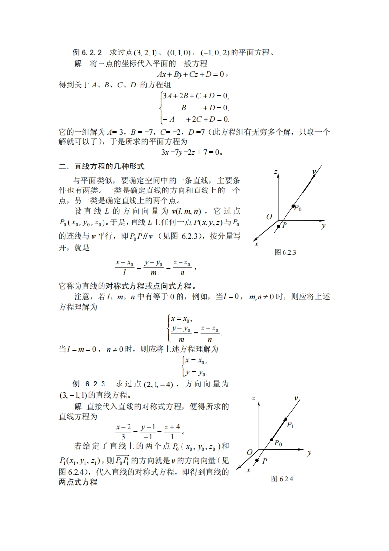 散案平面和直线教学内容平面和直线是几何学中最基本的研究对象,是一些向量空间和几何空间中某些对象的最基本原型。由于曲线在局部可以用它的切线来近似,曲面在局部可以用它的切平面来近似,所以平面和直线也是几何和分析中“以直代曲”的最基本元素。因此学习空间解析几何中处理平面与直线的方法非常重要,而且是必须要掌握的数学工具。在本节中主要讲解以下几方面的内容:(1)平面和直线的代数表示,即它们的方程的形式如何?以及如何用向量的运算方法来建立这些方程:(2)平面与平面,平面与直线、直线与直线,以及点与这些对象的位置关系,如距离、夹角等,以及如何利用代数方法来处理。教学思路和要求(1)首先讲解平面的方程、直线的方程、以及建立这些方程的方法。(2)讲解点与平面的距离、点与直线的距离公式的建立和运用。(3)讲解平面与平面,平面与直线、直线与直线的夹角概念与计算方法:(4)进一步,利用这些工具讲解一些具有某些特性的直线或平面的方程的具体计算方法。教学安排一.平面方程的几种形式在R3中,给定了与平面垂直的方向和平面上的一个点,就可以唯一决定这个平面。与平面垂直的方向称为这个平面的法向量。设所求平面π的法向量为(A,B,C),而且平面过点P(xo,yo,二o)。对平面π上的任何一点P(xy,z),P与P的连线依然在平面上,因而BP=(x-0y-o,2-2o)与n垂直,即nPP=0。用分量表示,就是A(x-x)+B(y-o)+C(-0)=0,这个关系式称为平面的点法式方程。记常数D=-(Ax。+By。+Czo),则上述方程可以写成Ax+By+Cz+D=0,○这个关系式称为平面的一般方程。例6.2.1求过原点O(0,0,0)和点P(6,-3,2),且图6.2.1与平面4x-y+2z=8垂直的平面方程。解记所求平面为π。因为π过原点O0,0,0)和点P(6,-3,2),所以其法向量n应与OP=(6,-3,2)垂直。又π垂直于平面4x-y+2z=8,所以n应与向量