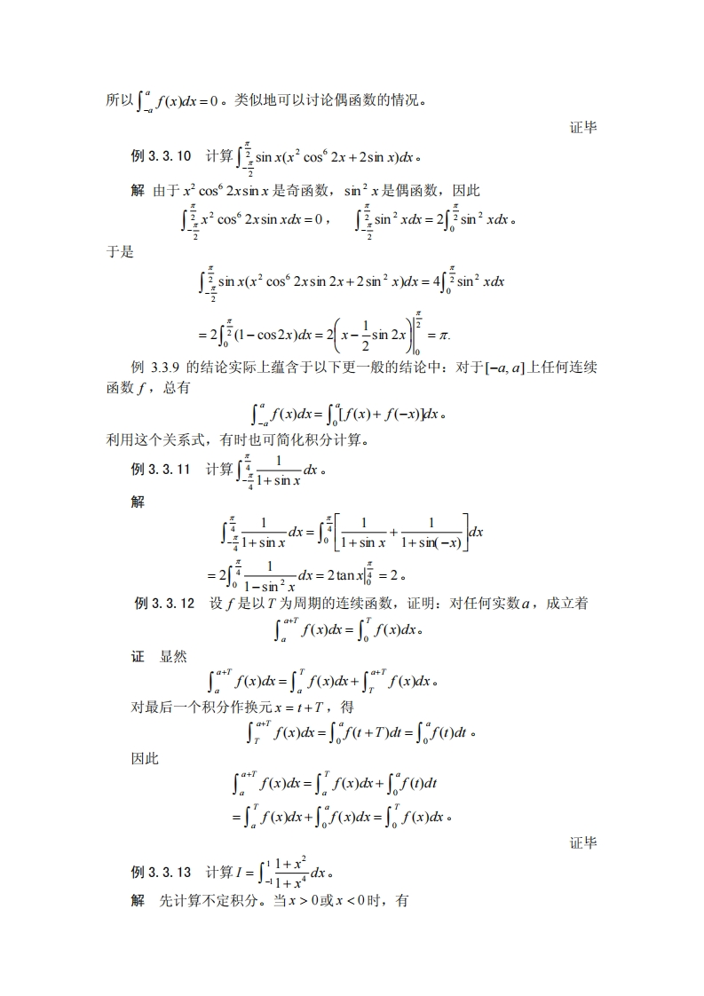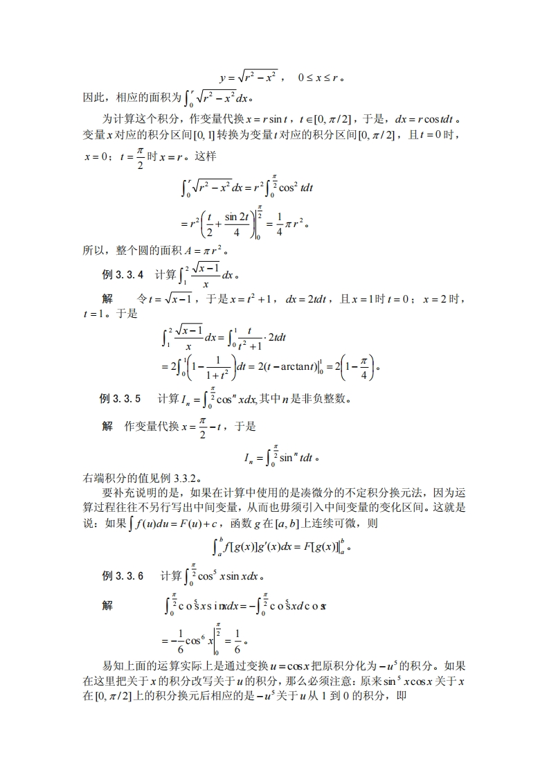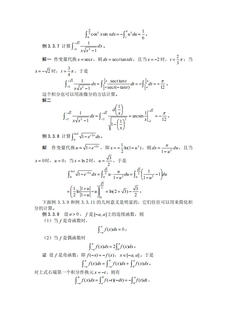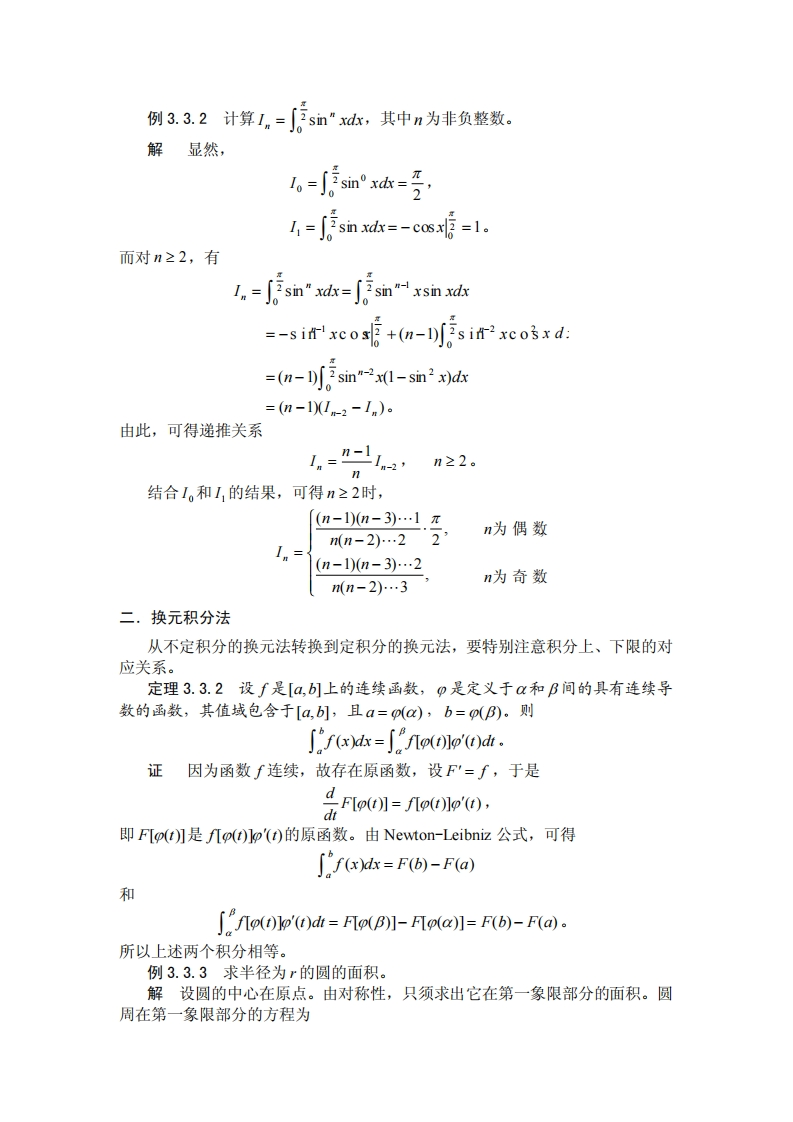 教案定积分的计算教学内容由Newton-Leibniz公式知道,函数的定积分等于其原函数在积分区间两端取值之差,因而为求定积分似应先算出相应的不定积分。但定积分计算的目标毕竞并非原函数而是积分的值,所以计算不定积分时常用的分部积分及变量代换等技巧在这里可以转变为直接适用于定积分计算的相应运算法则。定积分计算是微积分中的基本技术,是学生必须掌握的技能。本节主要讲解以下几方面的内容:(1)定积分的分部积分法:(2)定积分的换元积分法:(3)定积分的常用计算技巧:(4)定积分的近似计算(数值积分法)。教学思路和要求(1)定积分的分部积分法和换元积分法可以从不定积分的相应思想结合Newton-Leibniz公式得出:(2)定积分的计算有着许多特有的技巧,特别是在处理奇偶函数、周期函数和满足一定恒等关系的函数的定积分计算时,常有一些简便的方法,需特别指出,注意引导学生发挥主动意识,举一反三:(3)注意在讲授数值积分时强调背景思想,并指出误差估计。教学安排一,分部积分法定理3.3.1设函数u,v在[a,b)上具有连续导数,则∫uexr'e)c=xx北-∫xu(x)d,或∫uxh(ex)=uxr(ax北-∫xdx)。只要把Newton-Leibniz公式和不定积分的分部积分法相结合,便可得上述定积分的分部积分公式。例3.3.1求由曲线y=xsnx(0≤x≤π)和x轴围成的区域的面积A。解由定积分的几何意义知,A=0 xsinxd=-J。xdcosx0--xcos+fcoxd:30=π+sin6=π。