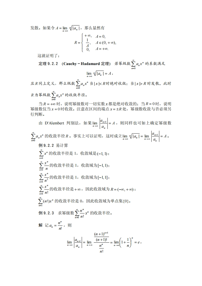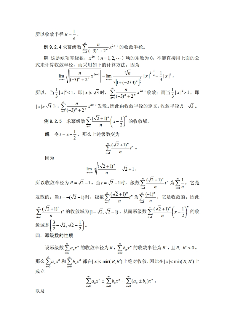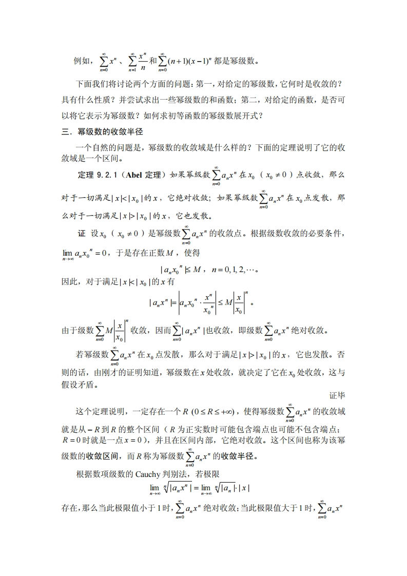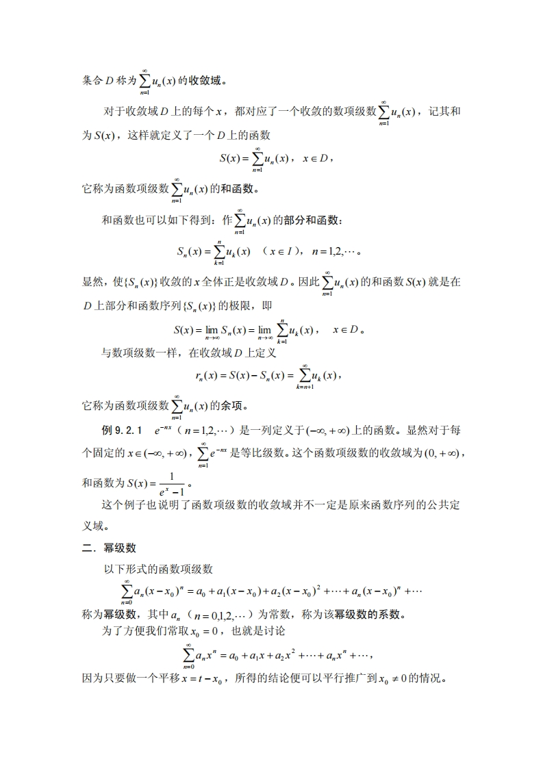 散案幂级数教学内容将初等函数展开成幂级数,是研究函数的表示、性质和进行近似计算的重要方法,也是微积分理论中不可或缺的一个部分。本节介绍幂级数的概念与性质,以及函数如何展开为幂级数问题,进一步还要指出幂级数在近似计算中的应用。具体内容如下:(1)幂级数的收敛半径和收敛域的概念及计算方法:(2)幂级数的和函数的连续性、逐项可导和逐项可积性质:(3)函数的Taylor级数的概念及初等函数的Taylor展开方法:(4)介绍利用函数的Taylor展开进行近似计算的方法。教学思路和要求(1)介绍函数项级数及其收敛域的概念,进而引出重要的幂级数的概念:(2)幂级数的收敛域有着独特的对称性,如何计算幂级数的收敛半径和收敛域是一个重点:(3)幂级数的和函数的连续性、逐项可导和逐项可积性质有着重要应用,因此也是课程中的一个重点,是学生必须要掌握的知识点:(4)函数的幂级数(Taylor级数)展开是微积分学中的重要工具,是学生务必要掌握的数学方法。关于这部分内容,首先讲解利用Taylor公式,将一些基本的初等函数展开为Taylor级数或Maclaurin级数。在此基础上,讲解一般初等函数的Taylor展开的方法,也就是间接展开法。(5)介绍函数的幂级数展开的应用,重点在于近似计算。教学安排一.函数项级数现在将级数的概念推广到通项为函数的情况。设u,(n=1,2,…)是一列定义在数集1上的函数(这时也称{u,}为函数序列),称用加号按顺序将这列函数连接起来的表达式41+42+…+um+…为函数项级数,记为4,。本章中为叙述方便也常记作山,似)。函数项级数的收敛性可以借助数项级数得到。定义9.2.1若对于固定的x。∈1,数项级数∑4(xo)收敛,则称函数项级数∑,()在点收敛,或称x是∑4,)的收敛点。这些收敛点全体所构成的