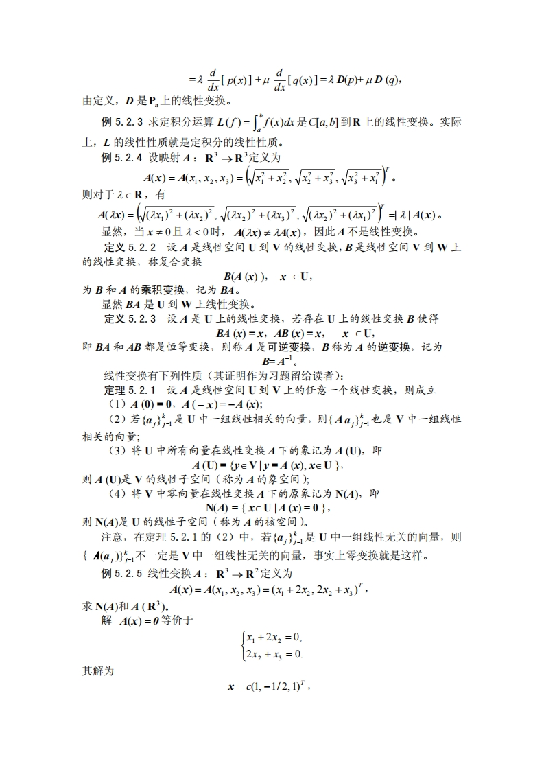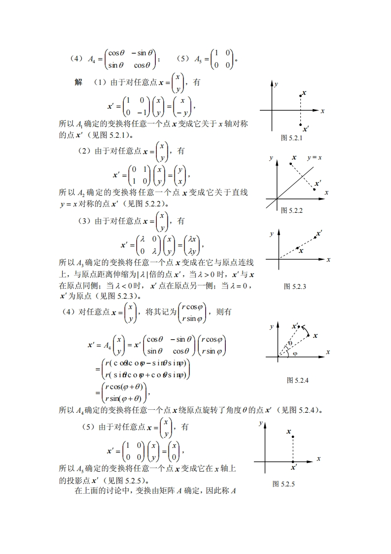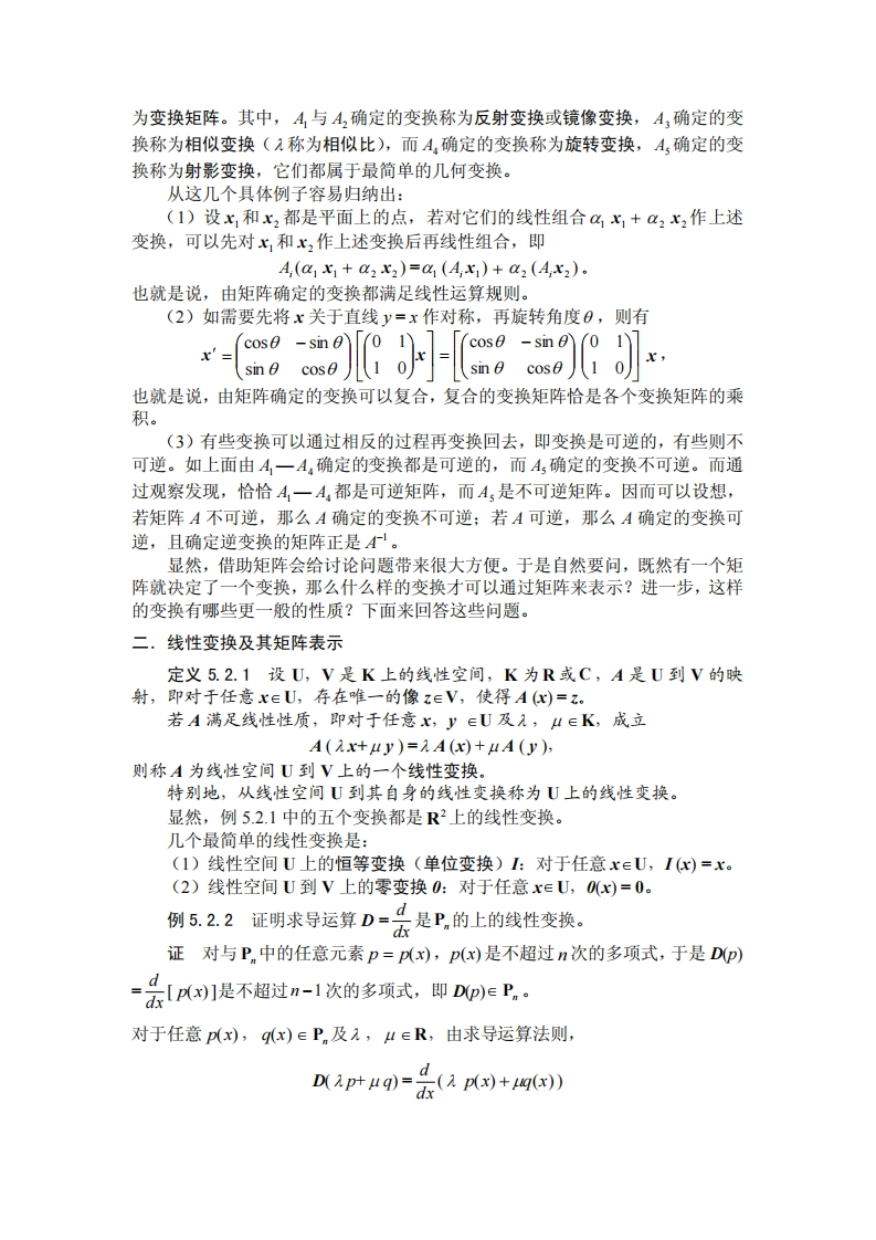 线形变换及其矩阵表示教学内容线形变换是几何空间和函数空间中最简单的变换,它有着深刻的几何学和物理学背景,是一个经常使用的数学工具,在数学理论研究和实际应用中起着重要作用。在这节中主要讲解以下几方面的内容:(1)线性变换的概念、乘积变换和可逆变换的概念:(2)线性变换的矩阵表示:(3)在不同基下的表示矩阵之间的关系:(4)在线性变换下坐标的变化情况。教学思路和要求(1)线性空间与线性变换这部分内容,由于其抽象性较强,所以首先要把其背景讲清楚,再抽象其理论定义。因此在教学安排上先从简单的几何变换入手,引导学生理解线性变换的概念的深刻含义,以及应有的形式。(2)线性变换的概念、线性变换的矩阵表示是本节内容的重点:(3)线性变换在不同基下的表示矩阵之间的关系也是要求必须掌握的内容;(4)为了使学生理解线性变换的矩阵表示的方法,可以先从向量空间上入手,便于理解;(5)要通过例子来引导学生学会计算表示矩阵以及不同基下的表示矩阵之间的关系等。教学安排一.几个简单的几何变换复杂的几何变换可以归结为简单的几何变换的累积,而任何几何图形的变换,说到底是点的变换。我们先从R2谈起。容易发现,若给定了一个2×2矩阵41412Aa21d22则对平面上任意点(即向量)x=通过矩阵与向量的乘法运算x'=Ax=可以唯一确定了平面上的一点x'。x'可以看成是由x经过某种变换得到的点,而这个变换的规律显然由矩阵A所确定。例5.2.1问以下矩阵对R2上的任意点x,由x'=A4,x(i=12,3.4,5)确定了什么样的变换?)4=0月3)4-6月