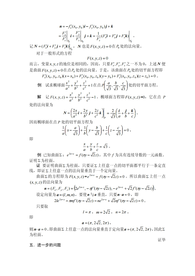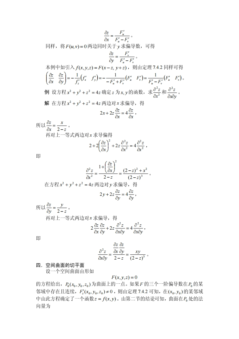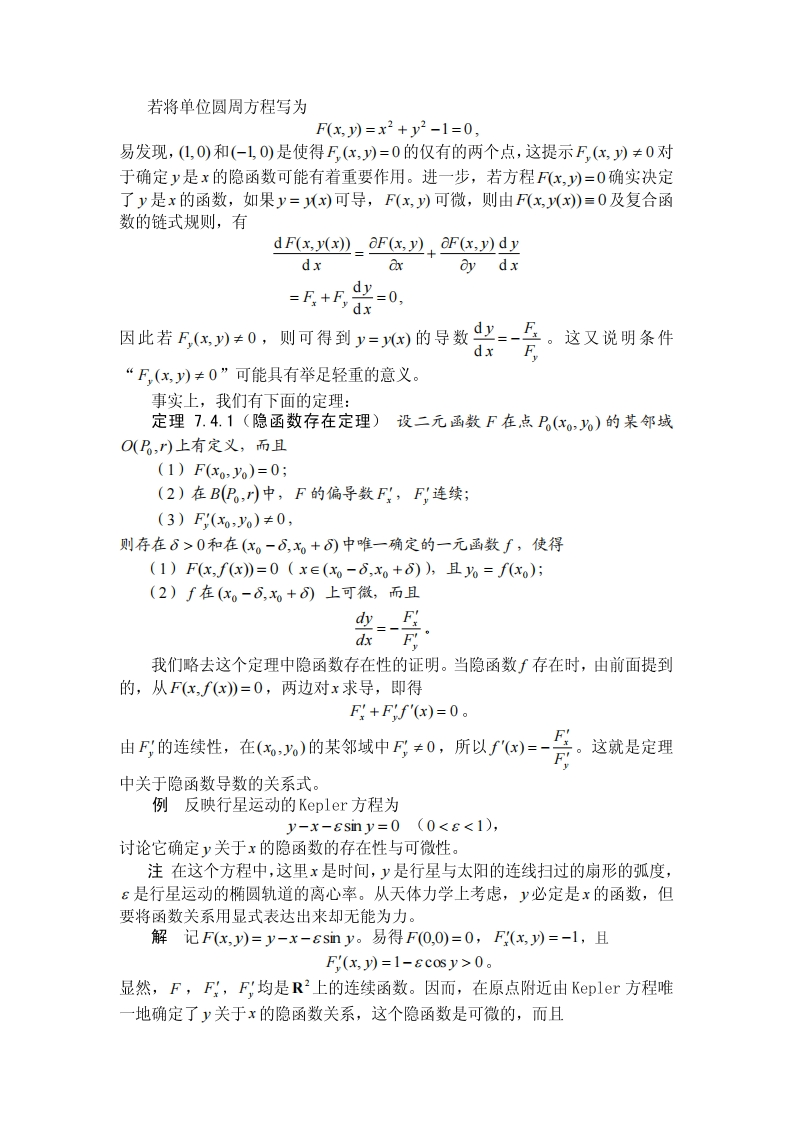 教案隐函数存在定理及应用教学内容考察一个方程或方程组是否确定一个隐函数(向量值函数),是一个在实际中经常遇到的问题。隐函数存在定理就是研究这个问题的基础。它不但在数学理论中起着重要作用,而且对实际应用问题起着指导作用。让学生掌握学好这个定理,并会用这个定理解决问题,是这节课的授课重点。本节课中主要讲解下面的内容:(1)隐函数存在定理成立的条件:(2)隐函数存在定理的结论与隐函数导数(偏导数)的计算:(3)空间曲面的切平面。教学思路和要求(1)通过例子说明隐函数存在是需要条件的,且存在性常常是有一定范围的,即存在性是局部性质。(2)讲述隐函数存在定理,并且讲述导数(偏导数)计算公式的推导过程,这可以对接下来的实际计算提供指导和方法上帮助。(3)举例说明如何计算隐函数的一阶和二阶导数(偏导数)等。(4)讲述对于由曲面一般方程所表示的曲面,如何计算它的切平面方程。教学安排一.问题的引入在讨论一元函数时,我们已经注意到两个变量x与y间的函数关系有时未必能表示为显函数y=f(x)的形式。设F是一个二元函数,由它导出的方程F(x,y)=0在一定条件下确定了x与y间的函数关系,我们称这类函数为隐函数。在什么条件下,隐函数是存在的?这个函数是否连续、可导?又如何求隐函数的导数?这些自然是人们关心的问题。对于多元函数和多元函数组(即向量值函数),同样提出了是否能由变量间满足的方程或方程组,确定相应的变量间的函数关系,以及这些函数是否可微等问题。先考察一个简单的方程x2+y2-1=0。它对应于平面上的单位圆周。容易知道在上半圆周(或下半圆周)上,除(L0)和(-10)这两点外,任何点处能取到一个邻域,在此邻域内,由方程x2+y2-1=0唯一确定了x与y间的函数关系,即y=V1-x2(y=-1-x2),其图象恰好是单位圆周落在该邻域中的一段弧。我们注意到圆周上在这种点处的切线斜率都是有限值。另一方面,在(1,0)和图7.4.1(-L,0)的任何邻域内,一个x值可能有两个满足方程x2+y2-1=0的y值与之对应,因而不能确定x与y间的函数关系。这说明,隐函数存在是有一定条件的。二.一元函数的隐函数存在定理