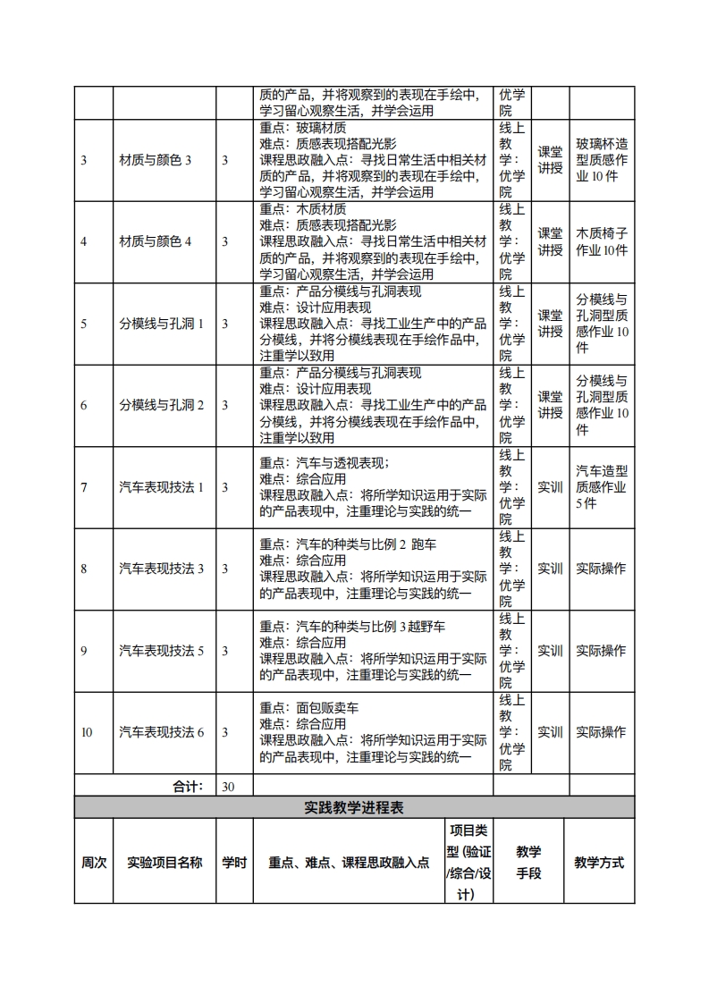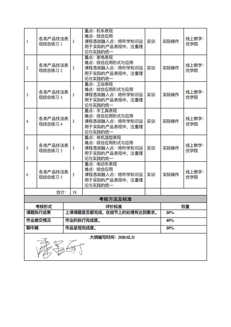 《产品表现技法(一)》教学大纲课程名称:产品表现技法课程类别(必修选修):课程英文名称:Design Sketch总学时/周学时/学分:其中实验实践学时:先修课程:授课时间:授课地点:授课对象:2018级工业设计系学生开课学院:粤台产业科技学院工业设计系任课教师姓名/职称:潘昌雨副教授答疑时间、地点与方式:课程考核方式:开卷()闭卷()课程论文()其它(√作品)使用教材,教学参考资料:蒲大圣宋杨刘旭,《产品设计手绘表现技法》,高等教育出版社。课程简介:本课程本课程主要在培养手绘之基础能力,使学生学会如何用简洁、有效或快速的方法,将想法以草图、图案的方式表现出来。课程中着重在纯手绘的基本练习,透过笔纸以及会图软件,适量的练习与作业,以循次渐进的教导,学习常用、基本的手绘表现技法;以提升学生手绘图形、图案与草图的沟通能力。课程教学目标本课程与学生核心能力培养之间1.理解透視法應用的关联(授课对象为理工科专业学生的课程填写此栏):2.顏色與材質平衡关系☑核心能力1.3.理解斷面線與分模線表達方式☑核心能力2.4.理解構圖之应用☑核心能力3.5.实际操作表現技法的各项工具口核心能力4.口核心能力5口核心能力6口核心能力7.口核心能力8.理论教学进程表学时周次教学主题教学的重点、难点、课程思政融入点教学教学数作业安排方式手段重点:全反射,雾面材质。线上难点:质感表现教几何造型材质与颜色12课程思政融入点:寻找日常生活中相关材学课堂质感作业质的产品,并将观察到的表现在手绘中,优学讲授10件学习留心观察生活,并学会运用院重点:亮面烤漆材质,木纹线上课堂几何造型材质与颜色23难点:质感表现搭配光影教讲授质感作业课程思政融入点:寻找日常生活中相关材学:10件