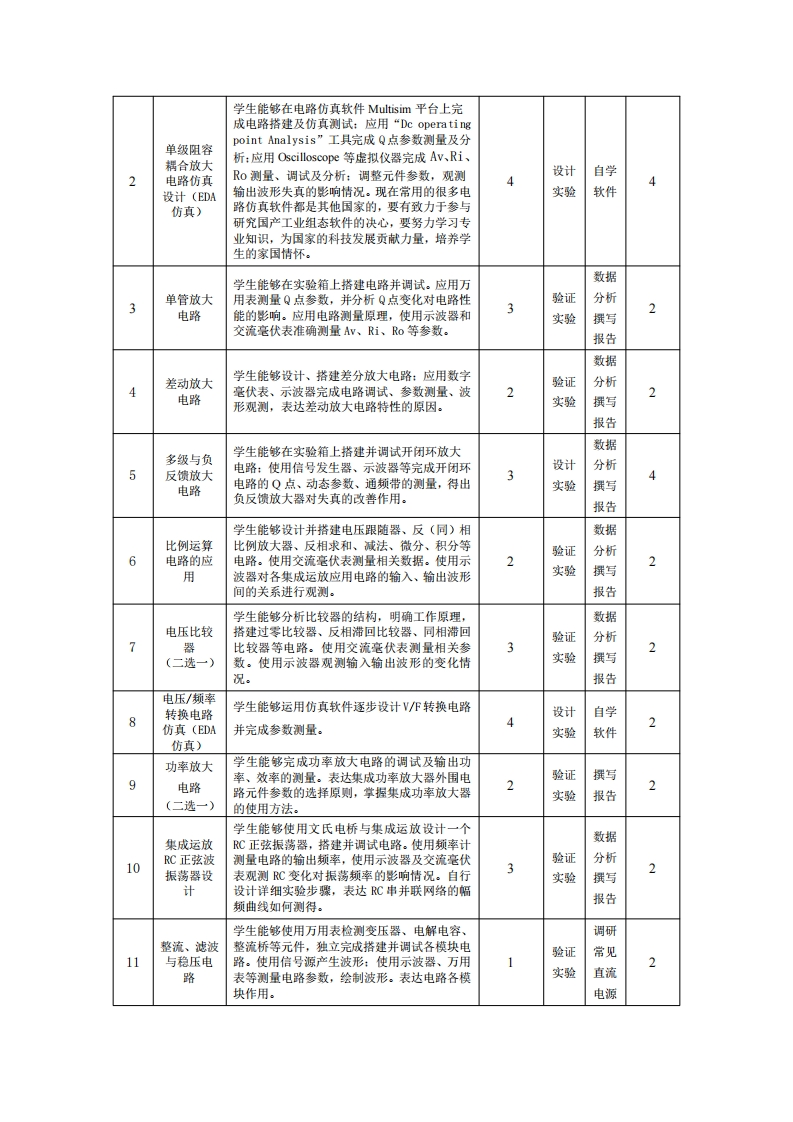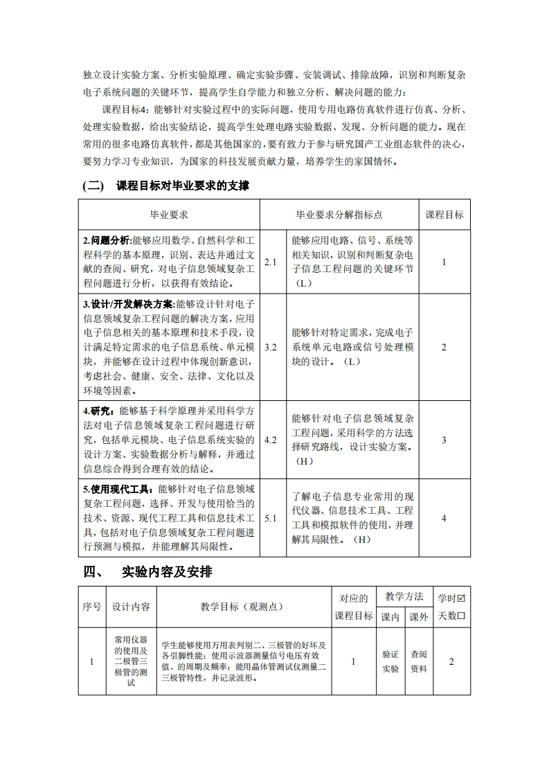 《模拟电子技术实验》课程教学大纲Analog electronic technology experiment主撰:马超审核:杨建华批准:、课程基本信息课程课程编码040035名称模拟电子技术实验学分0.75学时24实验性质演示实验口验证实验☑设计实验☑先修课程《电路分析》、《模拟电子技术基础》适用自动化、电子信息工程、通信工程、电劳动教育依托是口专业气工程及其自动化、机器人工程、生物课程否☑医学工程课程负马超开课电子信息工程学院责人单位二、课程简介模拟电子技术实验是针对电子信息工程学院自动化、电子信息工程、通信工程、电气工程及其自动化、机器人工程、生物医学工程专业开设的一门专业基础实验课,是与电子技术基础理论课密不可分的实验教学环节。为提高学生模拟电路综合设计能力,课程实验项目分为验证型实验和综合、设计型实验,验证型实验主要培养学生对电工电子技术基本理论的掌握、常用电子仪器仪表的使用以及ED仿真软件模拟设计的学习。综合、设计型实验重点培养学生独立设计实验方案、分析实验原理、确定实验步骤、安装调试、排除故障等综合设计能力,并撰写完整科学的实验报告,过程中通过自主解决问题,掌握一般电子电路分析方法和设计能力。三、课程目标及其对毕业要求的支撑(一)课程目标课程目标1:能应用常用电子仪器仪表测量原理及测量方法,准确测量实验过程中电路参数及实验现象,运用电子仪器仪表分析工具,分析、调试实验数据,判断实验现象的合理性,熟练掌握常用电子仪器仪表的使用:课程目标2:熟练运用模拟电路仿真软件,科学的制定实验方案,构建实验系统,掌握一般电子电路分析和设计的基本方法:课程目标3:能够运用模拟电子技术基础理论知识,根据实验目的及实验任务,学生能