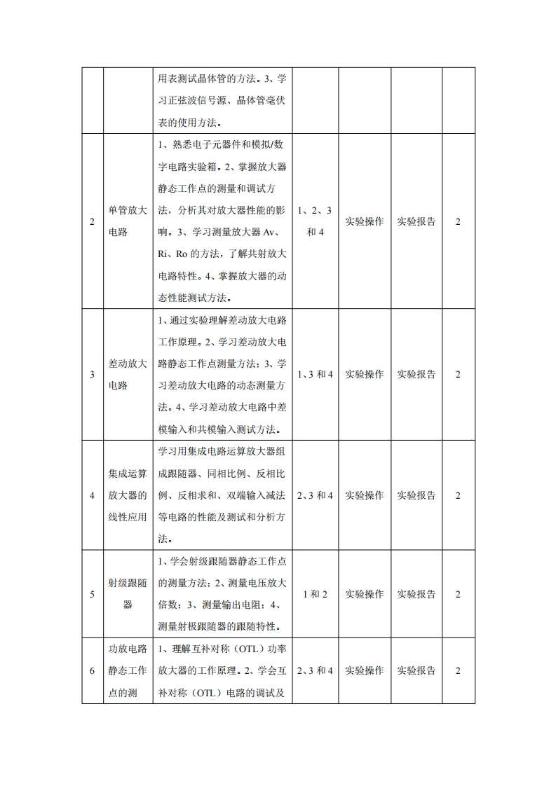 《模拟电子技术实验()》课程教学大纲Analog electronic technology experiment(A))主撰:韦宏利审核:杨建华批准:赵黎一、课程基本信息课程课程040066名称模拟电子技术实验(A)编码学分0.5学时16实验演示实验口验证实验☑设计实验☑性质先修《大学物理》、《高等数学》、《电工学》、《电路分析》课程适用测控技术与仪器、光电信息科学与工程(工学)、光电信息科学与工程(理学)劳动教育依托是口否☑专业机械电子、机械设计制造及自动化等课程课程负韦宏利开课责人单位电子信息工程学院二、课程简介《模拟电子技术实验(A)》是电子信息工程学院开设的一门针对光电、机电、计算机等专业开设的工程基础独立课设实验,是与模拟电子技术基础理论课密不可分的实验教学环节。通过实验不仅要验证理论知识,更重要的是培养学生的动手能力和数据处理能力,使学生能够独立地进行基本实验操作,分析实验结果,撰写完整科学的实验报告。学生必须完成实验指导书中基本技能实验部分的项目,不少于16学时。三、课程目标及其对毕业要求的支撑(一)课程目标课程目标1:熟练掌握电子仪器仪表的应用,培养学生扎实的工作作风和严谨的科学态度:课程目标2:加强对模拟电子技术理论知识的理解和掌握:课程目标3:培养提高学生的工程操作技能:课程目标4:锻炼学生处理实验数据、发现问题、分析问题和解决问题的能力。(二)课程目标对毕业要求的支撑课程目标毕业要求毕业要求分解指标点12340思想品德:具有坚定正0.2能够通过学习与社会实践,树立0.30.20.10.4确的政治方向、良好的正确的世界观、人生观、价值观,