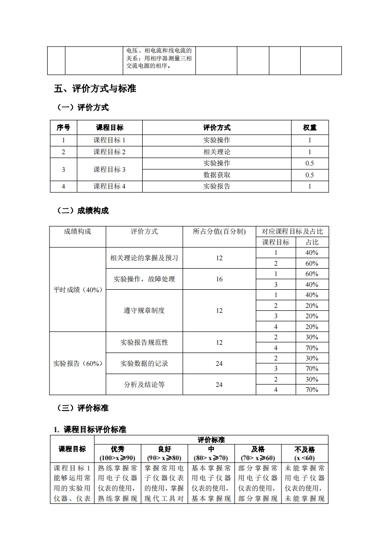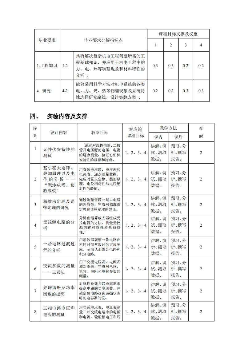 《电工技术实验(A)》教学大纲Experiment on Electrical technology主撰:刘敏审核:杨建华批准:赵黎课程基本信息课程编码040068课程名称电工技术实验(A)学分0.5学时16课程类别实践环节实验性质演示性实验☑验证性实验☑设计性实验☑先修课程高等数学、电工技术、工科电路分析适用专业机械电子工程,等劳动教育依托课程是口否☑课程负责人贺为婷开课单位电工电子实验教学示范中心二、课程简介《电工技术实验(A)》是针对机械设计制造机器自动化、机械电子工程等专业开设的专业基础实验课,是必不可少的实践教学环节。内容包括电工技术及电路原理实验。通过实验使学生加深对理论知识的理解,能够识别常用电子元器件并学会常用仪器仪表的使用方法,学会实验的设计、操作、实验数据获取和处理并撰写完整科学的实验报告。培养学生理论与实践综合应用的能力,提高学生的实践动手能力和创新能力,树立学生的工程实践思想。三、课程目标及其对毕业要求的支撑(-)课程目标课程目标1:掌握常用的实验用仪器、仪表的使用方法,并能比较准确地测量实验数据、判断其正确性。课程目标2:能够运用电路理论知识,分析实验原理,理解实验方案并完成实验内容。课程目标3:基本能够独立完成设计型实验的设计方案、确定实验步骤,并按时完成实验任务。提升了学生的实验能力和实际操作能力。课程目标4:实验中,能够发现问题,基本能够运用理论知识分析并解决问题。通过撰写实验报告,提高学生理解理论知识、分析和处理实验数据的能力。(二)课程目标对毕业要求的支撑