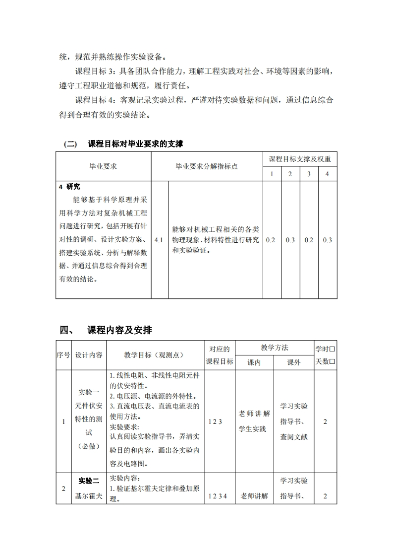 《电工电子实验》课程教学大纲Experiment of Electrical Engineering and Electronics)主撰:丁晓娜审核:杨建华批准:赵黎课程基本信息课程课程040148电工电子实验编码名称学分总学时讲课上机实验1/周数16/8学时学时学时16实验演示实验口验证实验☑设计实验☑(可多选)性质先修《电工电子技术》课程适用专业机械设计制造及其自动化、机械电子工程等课程负责人丁晓娜开课单位电子信息工程学院二、课程简介《电工电子实验》是针对机械设计制造及其自动化、机械电子工程等专业开设的一门独立的实践性专业基础课程,是学生在系统接受专业学习过程中一个不可缺少的环节,为该专业学生的必修课。通过不同类型实验的具体实践,提高学生自主学习的能力,巩固该专业相关电学的基本概念和基本理论,掌握相关实验仪器设备的使用方法,理解工程实践对社会、环境等因素的影响和应承担的责任,培养学生能够基于科学原理并采用科学方法对相关专业中复杂电学工程问题进行研究,包括实验操作、分析与解释数据、并通过信息综合得到合理有效的结论。培养学生理论与实践综合应用的能力,提高学生的实践动手能力和创新能力,树立学生的工程实践思想。三、课程目标及其对毕业要求的支撑(一)课程目标课程目标1:预习并熟练掌握电工电子技术中的理论知识,了解实验目的,理解实验原理。课程目标2:能够对实验原理进行研究,制定合理的实验方案,搭建实验系