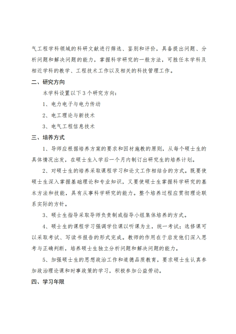 080800电气工程学术学位(全日制)硕士研究生培养方案一、培养目标以我国经济建设和能源行业发展中的科学和技术问题为导向,在开展电气工程领域的基础与应用研究的过程中,培养德、智、体全面发展,掌握电气工程的基础理论和专业知识,适应现代科技发展和社会经济建设需要,服务于电气工程领域的学术型、复合式高层次工程技术和工程管理人才。(1)素质要求拥护中国共产党的领导,坚定不移地走中国特色社会主义道路。热爱祖国,遵纪守法,积极为社会主义建设服务。身心健康、品行端正、爱岗敬业、团结协作、求真务实、勇于创新。(2)知识要求掌握马克思主义的基础理论,掌握电气工程学科扎实的基础理论和系统的专门知识,能够综合运用电网及其自动化、电力电子与新能源发电、电机及其控制、高电压、电气信息等相关技术,具有独立担负专门技术工作和从事科学研究的能力。至少掌握一种计算机程序语言及编程方法,掌握一门外国语,具有一定的写作能力和口语表达能力,掌握本学科国内外发展现状和发展趋势。(3)能力要求具有快速获取符合自己需求的知识的能力,能够客观而正确地对电