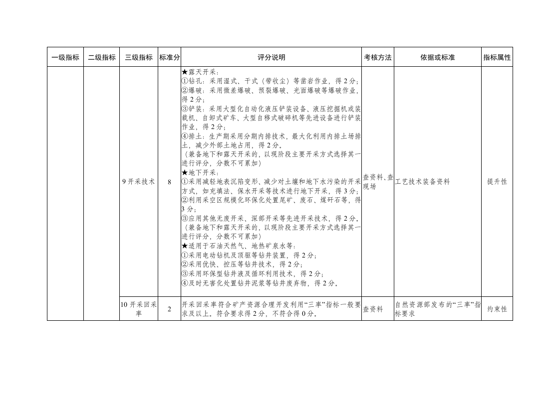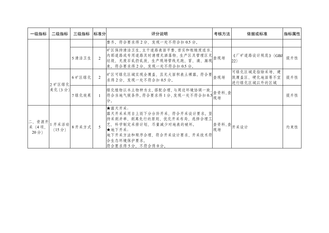 附件1四川省省级绿色矿山建设评价指标先决条件要求说明手续齐全,证照合法有效《采可矿许可证》《安全生产许可证》《营业执照》证照合法有效,依法办理环评和排污许可手续、并依法完成竣工环保验收。合格口三年内未受行政处罚近三年内(自申报绿色矿山之日起前三年),未受到自然资源和生态环境等部门行政处罚,或不合格▣或已整改到位受到处罚在履行期限内已执行到位(出具相关证明材料),且未发生过较大及以上安全生产李故、环境事件的。满足所有先决条件方可进行打分可矿业权人异常名录可矿山参加遴选期间,矿业权人未被列入矿业权人勘查开采信息公示异常名录评价,其中1条不满足的,即为矿山要求矿山近三年内正常生产运营,且剩余储量可采年限(按储量年度报告)不少于三年。不合格。可矿区范围国矿区范固未涉及生态保护红线(国家有规定的除外),符合国土空间规划及规划环评要求。级指标二级指标三级指标标准分评分说明考核方法依据或标准指标属性可区按生产区、管理区、生活区进行功能分区,符合分区要1功能分区求。符合要求得2分,管理区、生活区分区不明显扣0.5分查资料、查矿区总平面布置图或示意2现场图,《工业企业总平面设计提升性生产区、管理区分区不明显扣1.5分。规范》(GB50187)矿区地面运输、供水、供电等配套设施齐全、正常运行,食堂、澡堂、厕所等设施齐全、整洁规范,对矿区建筑、构筑一、矿区环2配套设施2物及时维护、维修或粉刷,生产区、管理区、生活区的所有查资料、查树区总平面布置图1可矿容矿貌现场提升性境(7项,12场所不存在私搭乱建等临时建筑、废弃建构筑物。符合要求分)(9分)得2分,发现一处不符合扣0.5分,矿区按要求设置操作提示牌、说明牌、线路示意图牌等各类3标识标牌1标牌,标牌的尺寸、形状、颜色设置符合规定,符合要求得查现场《标牌》(GB/T13306)提升性分,发现一处不符合扣02分。14定置管理2设备、物资材料规范管理,做到分类分区、摆放有序、堆码查现场提升性