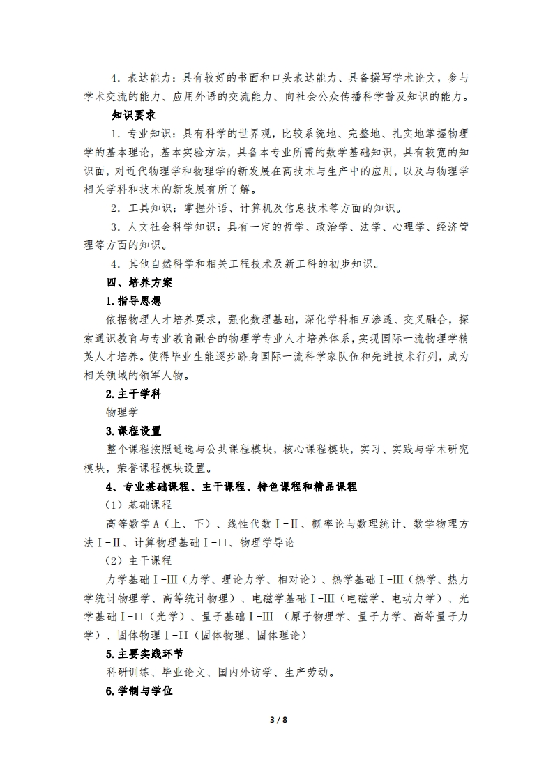 兰州大学“基础学科拔尖学生培养计划2.0”2019级物理学专业人才培养方案一、培养定位与目标根据兰州大学拔尖计划2.0实施方案,在加强“导师制、学分制、书院制”培养模式基础上,强化使命驱动,注重大师引领,创新学习方式,提升学生综合素质,促进学科交叉与科教融合,深化国际合作,科学选才鉴才,打造基础学科拔尖人才培养新模式。培养学生具有扎实宽广的基础理论,科学实验能力强,科研思想活跃、国际视野开阔、发展潜力明显,能从事物理学及交叉学科领域研究、未来能进入世界科学家或工程技术学术圈、逐步成长为国际学术界或工程技术界领军人物,并逐步跻身国际一流科学家队伍。二、培养思路1.教育理念按照“加强数理基础,突出学科交叉,强化综合能力”的培养方式,采取“导师制、学分制、书院制”教学理念,在普通物理、四大力学等物理核心课程基础上,开设理工交叉、新工科等领域选修课程:推行导师制,由国内外知名教授组成专业指导小组、课程教学小组,负责学生的培养工作;实行学分制培养,完善课程体系,加强科研训练和小课题研究实践环节,注重学生的个性化需求:加强书院制建设,营造“浸出来”“养出来”“熏出来”“育出来”的文化氛围:注重开展国际交流合作培养,选派学生到世界一流大学进行交流学习,着力培养学生综合能力。2.个性化培养开设兴趣班、讨论班,加强科研训练、小课题研究等实践环节,在双向选择的基础上,为学生配备学业导师和科研导师,进行学业指导和科研训练。实行三学期制。春季、秋季学期主要学习文化课知识,暑期小学期主要开设讨论班,进行科研训练、学科竞赛和短期国际交流,邀请国内外专家短期授课或讲座等。3.选拔机制和动态管理聘请学术造诣深厚、具有国际视野的相关学科知名专家学者担任选拔小组成员。大一结束,根据兴趣志向、数理基础和发展潜质,在全校范围内进行公开选拔测试,初步确定30名学生入选物理萃班。并在后期动态调整,最终确定20名学生正式进入萃英班。选拔学生的首要要求是要对物理学习、研究及应用有浓厚兴趣,有远大志向和抱负,并愿意为此不懈努力。1/8