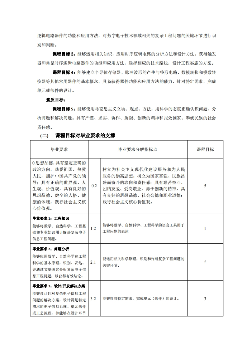 《数字电子技术基础》课程教学大纲(Digital Electronic Technology)主撰:汤海审核:批准:课程基本信息课程课程数字电子技术基础编码2335名称学分讲课上机实验3.5总学时565600学时学时学时课程数学与自然科学类口人文社会科学类口学科基础类√专业类口类别先修高等数学、大学物理、电路、模拟电子技术课程适用专业电子信息课程负责人杨聪锟开课单位电子信息工程学院电工电子教学部二、课程简介数字电子技术基础是一门电子技术方面入门性质的技术基础课程。本课程旨在使学生获得数字电子技术方面的基本理论、基本知识和基本技能,获得各种常见的组合逻辑电路、时序逻辑电路的分析与设计方法,为深入学习后续专业基础课程和专业课程打好基础。课程主要讲述数字电路和逻辑函数的基本概念,组合逻辑电路、时序逻辑电路的分析与设计方法,以及其他一些常见的数字电路的工作原理和基本使用方法。通过这些教学内容的学习,学生应能够应用数字电路的基本理论,掌握常见数字电路器件的电路功能和基本使用方法,能对组合逻辑、时序逻辑电路进行分析与设计。三、课程目标及其对毕业要求的支撑(一)课程目标知识目标:课程目标1:能够建立数制与码制、逻辑代数基础、逻辑门电路的基本概念和分类,建立数字电路的基本概念,明确对数字电路的基本要求,具备解决复杂电子信息工程问题所需的工程基础知识。能力目标:课程目标2:能够运用相关知识,应用组合逻辑电路的分析和设计方法,获得常见组合