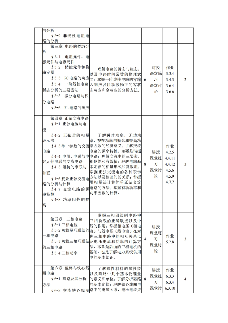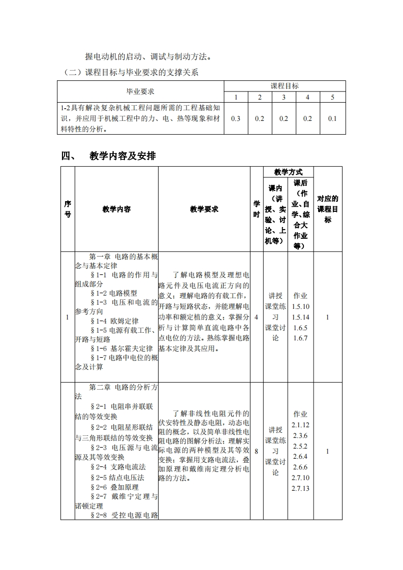 电工技术ElectricianTechnology主撰:王泽民审核:闫克丁批准:一、课程基本信息课程课程编码2429名称电工技术学分总学时讲课上机实验3484800学时学时学时课程数学与自然科学口人文社会科学口工程基础口专业基础口√专业课口类别先修课程大学物理、高等数学适用专业机械电子工程、机械设计制造及其自动化开课电子信息工程学院单位二、课程性质与目的本课程是工科类非电专业的一门专业技术基础课程。本课程旨在使学生了解电工技术的应用及发展概况,懂得电路的基本作用、基本规律和基本分析方法:获得电技术入门的必要基础理论、基本知识和基本技能:为学习后续课程以及从事与本学科有关的工程技术工作打下一定的基础。三、课程目标及其对毕业要求的支撑(一)课程目标课程目标1:理解电路的基本概念和基本定律,掌握电路的基本分析方法:课程目标2:理解电路的暂态与稳态,掌握一阶线性电路的三要素分析方法:课程目标3:掌握正弦电路的基本分析与计算方法,理解功率因数提高的意义及方法,理解安全用电及常见的保护方法:课程目标4:理解磁性材料的磁性能以及相关物理量的意义和单位:理解分析磁路的基本定律:掌握变压器、电磁铁等常见电工设备的工作原理与分析方法:课程目标5:理解三相异步电动机的基本构造,转动原理,机械特性,掌