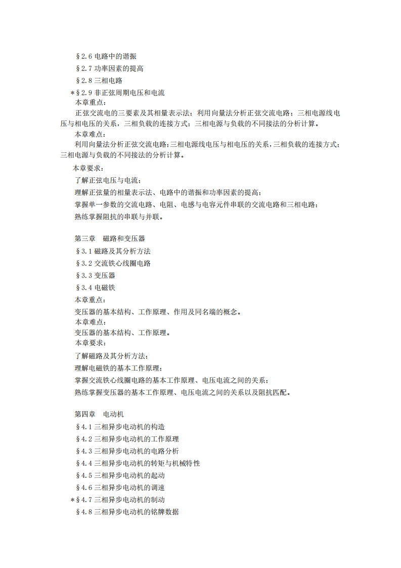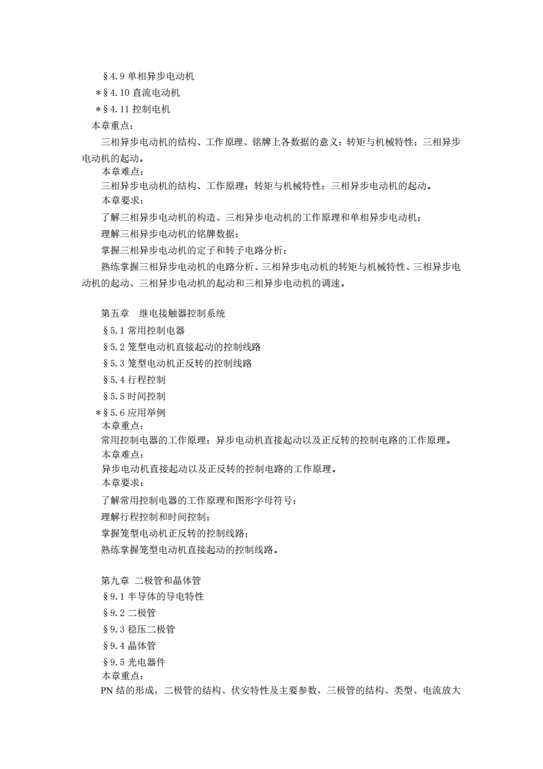 《电工电子技术》课程教学大纲一、课程标识课程编码:2431英文名称:Electrical Engineering总学时:56实验:0上机:0适合专业:机械、材料化工、工业设计、包装等四年制本科二、课程内容及要求第一章电路及其分析方法§1.1电路的作用与组成部分§1.2电路模型§1.3电压和电流的参考方向§1.4电源有载工作、开路与短路§1.5基尔霍夫定律§1.6电路的串联与并联§1.7支路电流法§1.8叠加定理§1.9电压源与电流源及其等效变换§1.10戴维宁定理§1.11电路中电位的计算§1.12电路的暂态分析本章重点:电压源与电流源的等效互换、支路电流法、叠加定理、戴维宁定理的电路分析。本章难点:电压源与电流源的等效变换,叠加定理,利用戴维宁定理求解二端网络开路电压、等效电阻的方法。本章要求:了解电路的作用与组成部分和电路模型:理解电压和电流的参考方向和电路的暂态分析:掌握电源有载工作、开路与短路、基尔霍夫定律和电路中电位的计算:熟练掌握电路的串联与并联、支路电流法、叠加定理、电压源与电流源及其等效变换和戴维宁定理。第二章正弦交流电路§2.1正弦电压与电流§2.2正弦量的相量表示法§2.3单一参数的交流电路§2.4电阻、电感与电容元件串联的交流电路§2.5阻抗的串联与并联