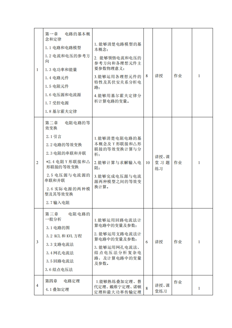 《电路分析》课程教学大纲(Circuit analysis)主撰:张雪薇审核:批准:课程基本信息课程课程编码3071电路分析名称学分讲课上机实验5总学时808000学时学时学时课程数学与自然科学类口人文社会科学类口工程基础类回专业基础类口专业类口类别先修高等数学、大学物理课程适用专业电子信息工程、自动化、通信工程、电气工程及其自动化课程负开课责人张雪薇单位电子信息工程二、课程简介《电路分析》是电类专业的一门专业基础课。本课程旨在使学生理解与掌握工程电路定理、定律和电路参数综合计算的方法。课程主要讲授电路定律、电路定理、电阻电路的一般分析方法,储能元件一阶和二阶电路的时域分析方法,正弦稳态电路的分析方法,含有耦合电感电路及电路频率响应的分析方法,三相电路分析与计算方法,非正弦周期电流电路及二端口网路电路参数的计算方法,通过这些教学内容的学习,学生应建立电路分析的概念,具有运用电路定律、电路定理和电路分析方法等解决工程实际电路参数计算的能力。三、课程目标及其对毕业要求的支撑(一)课程目标知识目标:课程目标1:熟练掌握并运用电路的基本概念、电路定律、电阻电路分析方法、电路定理及常用电路的等效变换方法计算常规电路的电压、电流、功率等参数:能针对具体的对象建立数学模型并进行分析求解电子、电气工程中简单电路问题。能力目标:课程目标2:能够运用电路的换路定律理解一阶和二阶电路的时域分析方法与计算方法:对复杂电气、电子工程问题存在的各类动态电路过程进行观测和分析,并能进行正确表